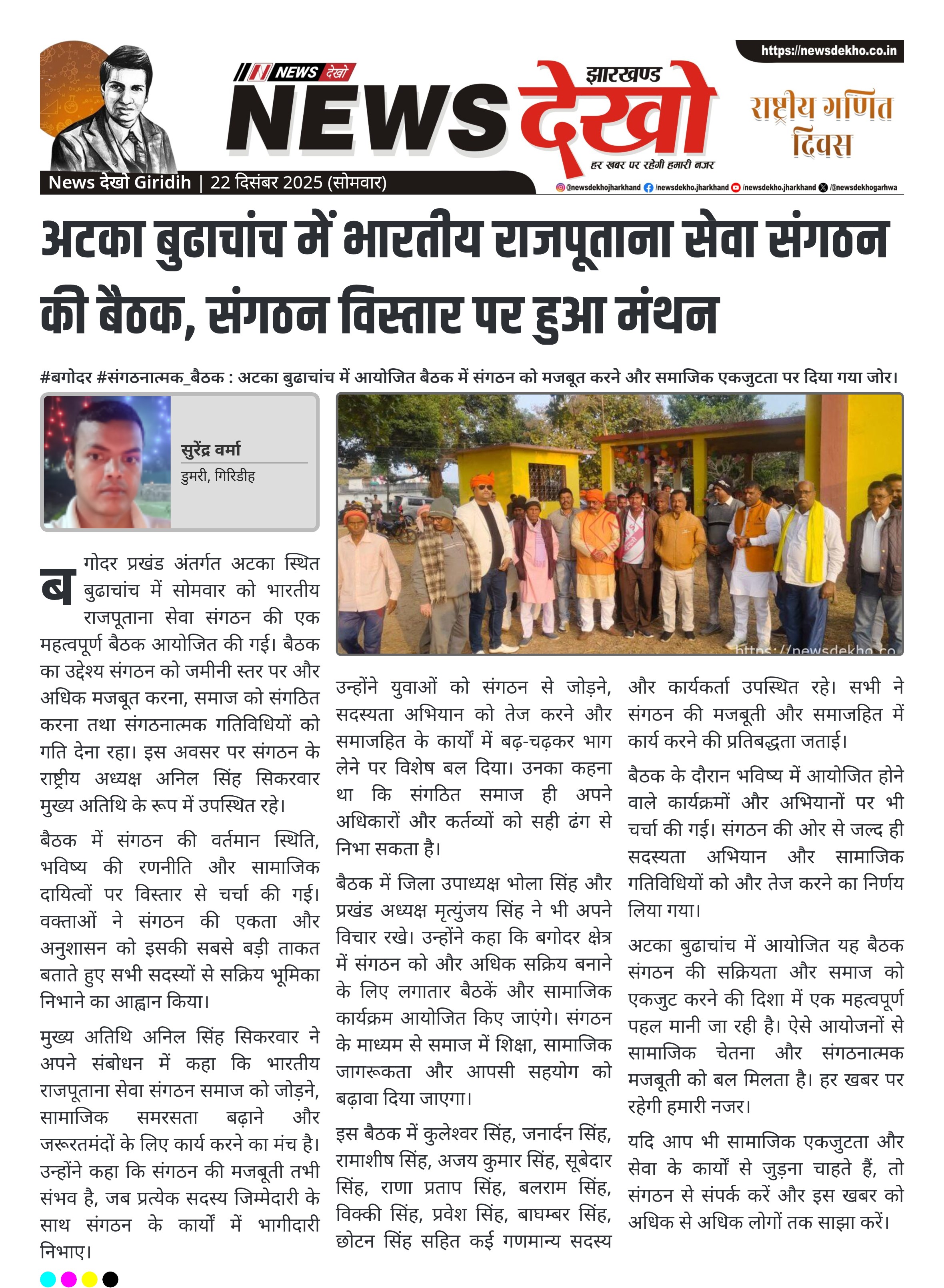 #बगोदर #संगठनात्मक_बैठक : अटका बुढाचांच में आयोजित बैठक में संगठन को मजबूत करने और समाजिक एकजुटता पर दिया गया जोर। अटका बुढाचांच में भारतीय राजपूताना सेवा संगठन की बैठक आयोजित। राष्ट्रीय अध्यक्ष अनिल सिंह सिकरवार मुख्य अतिथि के रूप में रहे मौजूद। जिला उपाध्यक्ष भोला सिंह एवं प्रखंड अध्यक्ष मृत्युंजय सिंह की सक्रिय सहभागिता। संगठन विस्तार, सदस्यता बढ़ाने और सामाजिक भूमिका पर चर्चा। बड़ी संख्या में स्थानीय कार्यकर्ता एवं समाज के लोग रहे उपस्थित। बगोदर प्रखंड अंतर्गत अटका स्थित बुढाचांच…