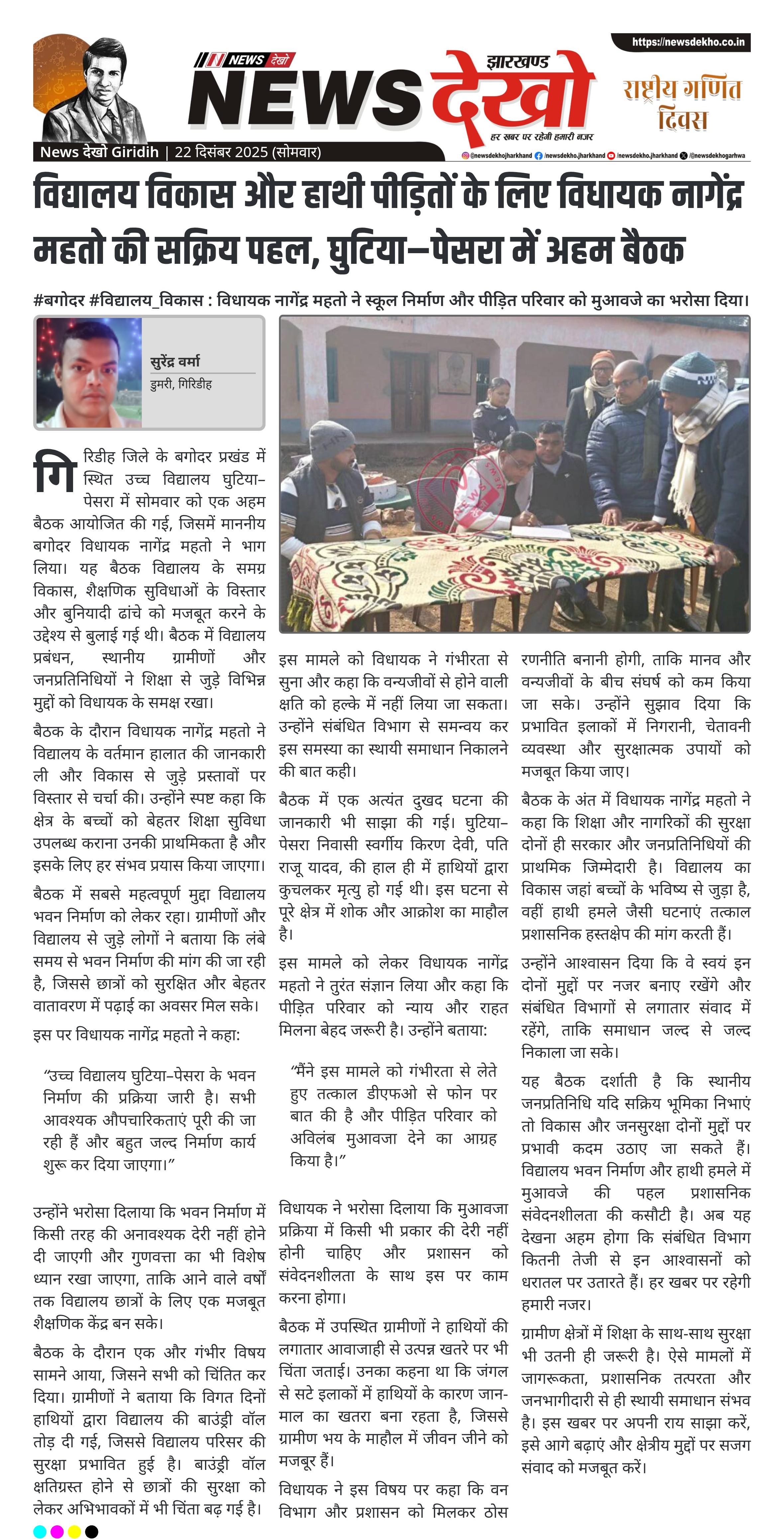 #बगोदर #विद्यालय_विकास : विधायक नागेंद्र महतो ने स्कूल निर्माण और पीड़ित परिवार को मुआवजे का भरोसा दिया। उच्च विद्यालय घुटिया–पेसरा में विकास कार्यों को लेकर बैठक आयोजित। विधायक नागेंद्र महतो ने स्कूल भवन निर्माण शीघ्र शुरू होने का आश्वासन दिया। हाथियों द्वारा विद्यालय की बाउंड्री वॉल तोड़े जाने की जानकारी सामने आई। घुटिया–पेसरा निवासी स्व. किरण देवी की हाथी हमले में मौत का मामला उठा। विधायक ने डीएफओ से बात कर तत्काल मुआवजा देने का आग्रह किया। गिरिडीह जिले के…