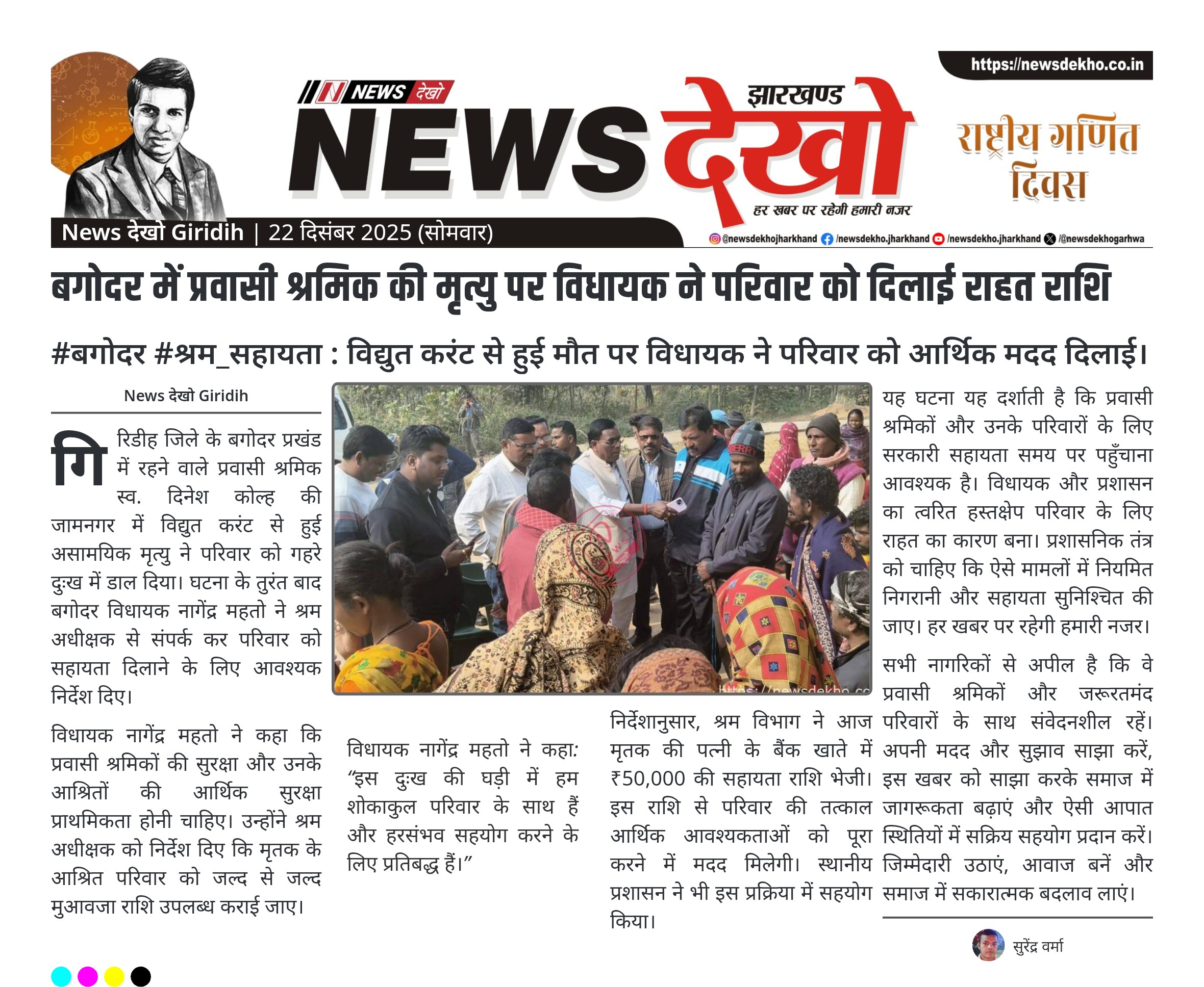 #बगोदर #श्रम_सहायता : विद्युत करंट से हुई मौत पर विधायक ने परिवार को आर्थिक मदद दिलाई। स्थान: ग्राम बिहारो (कोल्हरीया टोला), बगोदर, गिरिडीह। घटना: प्रवासी श्रमिक दिनेश कोल्ह की जामनगर में विद्युत करंट से मृत्यु। सहायता राशि: ₹50,000, श्रम विभाग के माध्यम से परिवार को हस्तांतरित। मुख्य हस्तक्षेपकर्ता: बगोदर विधायक नागेंद्र महतो। संवेदनशीलता: विधायक ने शोकाकुल परिवार के प्रति गहरी संवेदना जताई। गिरिडीह जिले के बगोदर प्रखंड में रहने वाले प्रवासी श्रमिक स्व. दिनेश कोल्ह की जामनगर में विद्युत करंट…