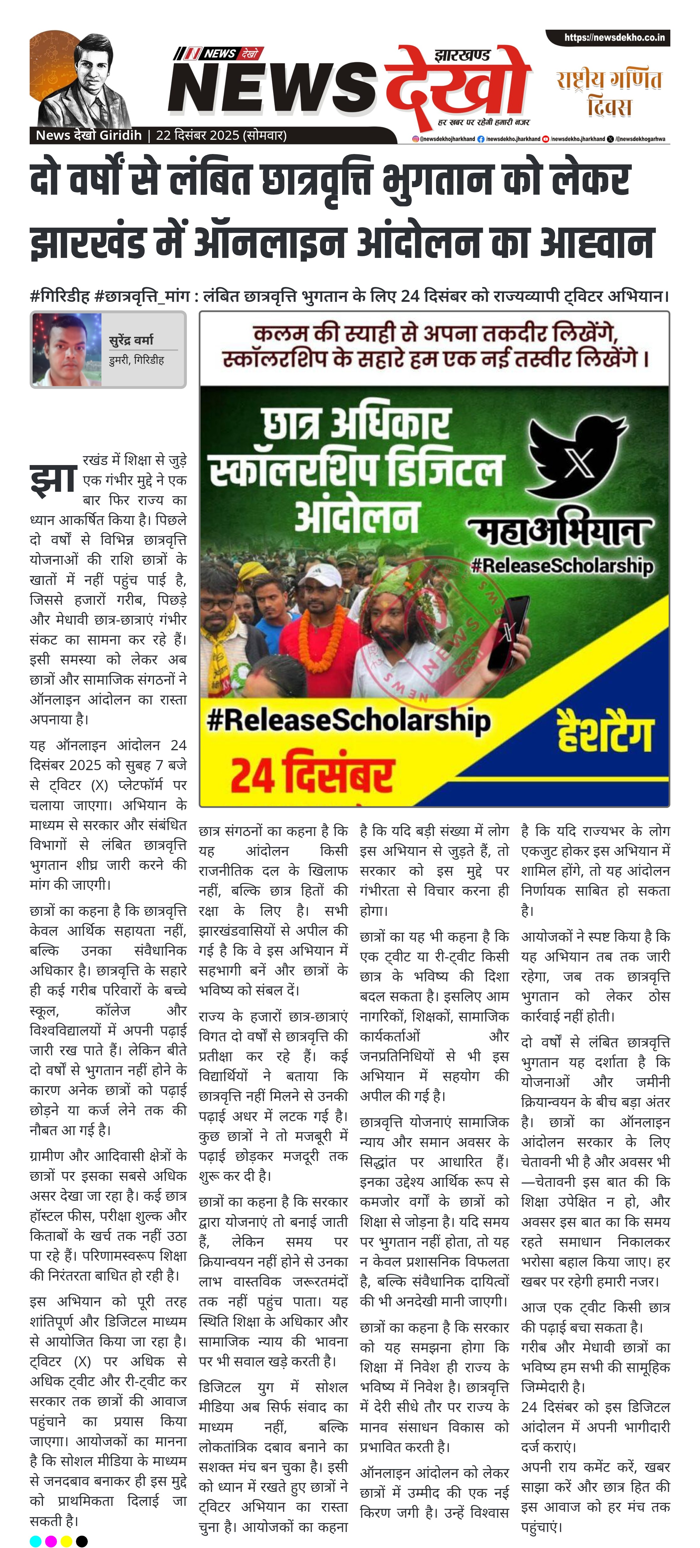 #गिरिडीह #छात्रवृत्ति_मांग : लंबित छात्रवृत्ति भुगतान के लिए 24 दिसंबर को राज्यव्यापी ट्विटर अभियान। 24 दिसंबर 2025 को सुबह 7 बजे से ट्विटर अभियान। दो वर्षों से लंबित छात्रवृत्ति भुगतान का मुद्दा। गरीब और मेधावी छात्रों के भविष्य से जुड़ा सवाल। अधिक ट्वीट और री-ट्वीट से आंदोलन को मजबूती। राज्यव्यापी ऑनलाइन सहभागिता का आह्वान। झारखंड में शिक्षा से जुड़े एक गंभीर मुद्दे ने एक बार फिर राज्य का ध्यान आकर्षित किया है। पिछले दो वर्षों से विभिन्न छात्रवृत्ति योजनाओं की…