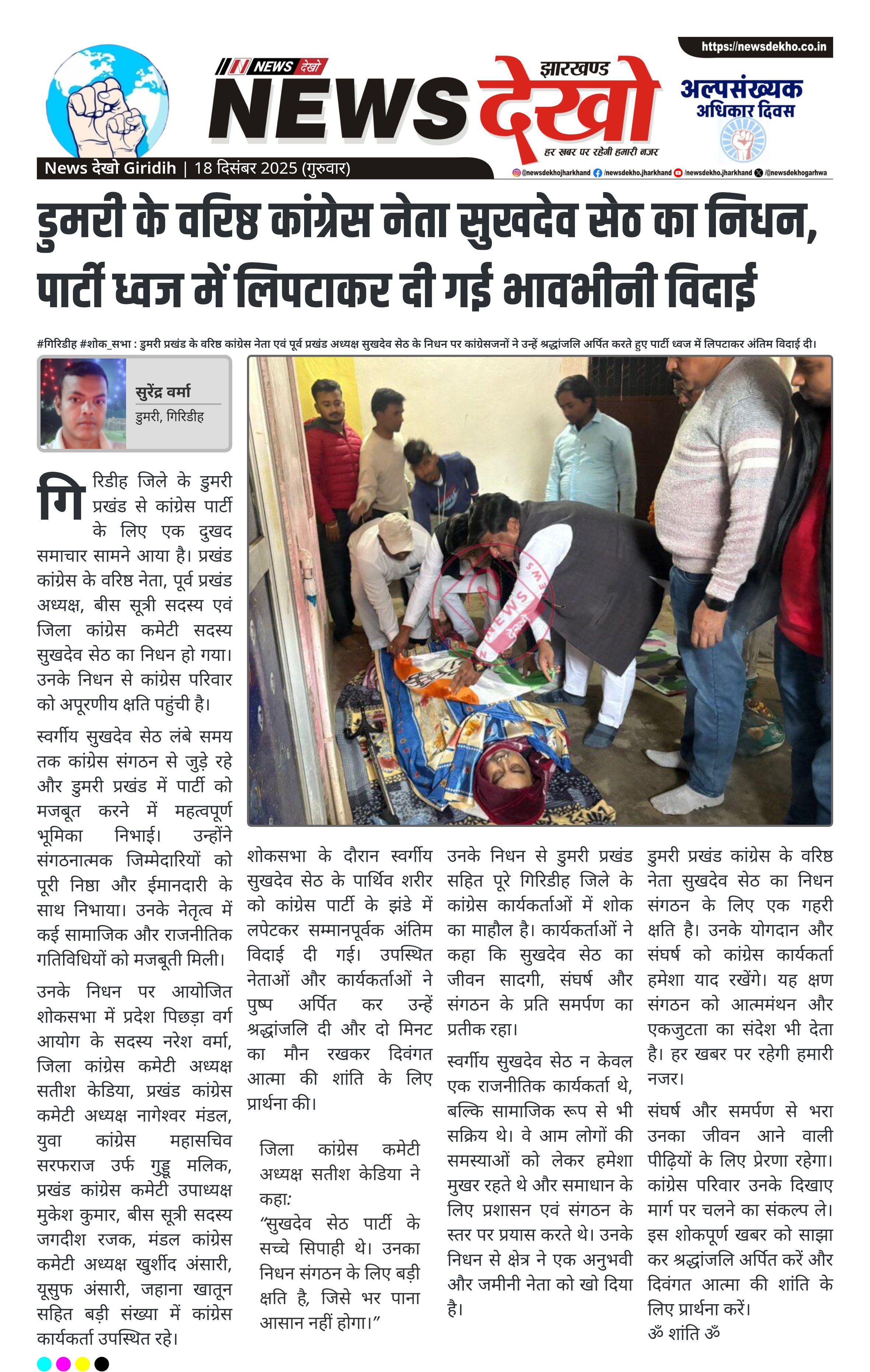 #गिरिडीह #शोक_सभा : डुमरी प्रखंड के वरिष्ठ कांग्रेस नेता एवं पूर्व प्रखंड अध्यक्ष सुखदेव सेठ के निधन पर कांग्रेसजनों ने उन्हें श्रद्धांजलि अर्पित करते हुए पार्टी ध्वज में लिपटाकर अंतिम विदाई दी। सुखदेव सेठ डुमरी प्रखंड कांग्रेस के वरिष्ठ नेता थे। पूर्व प्रखंड अध्यक्ष और बीस सूत्री सदस्य रह चुके थे। जिला कांग्रेस कमेटी के सक्रिय सदस्य के रूप में योगदान। कांग्रेस नेताओं व कार्यकर्ताओं ने दी भावभीनी श्रद्धांजलि। पार्टी झंडे में लपेटकर दी गई अंतिम विदाई। शोकसभा में बड़ी…