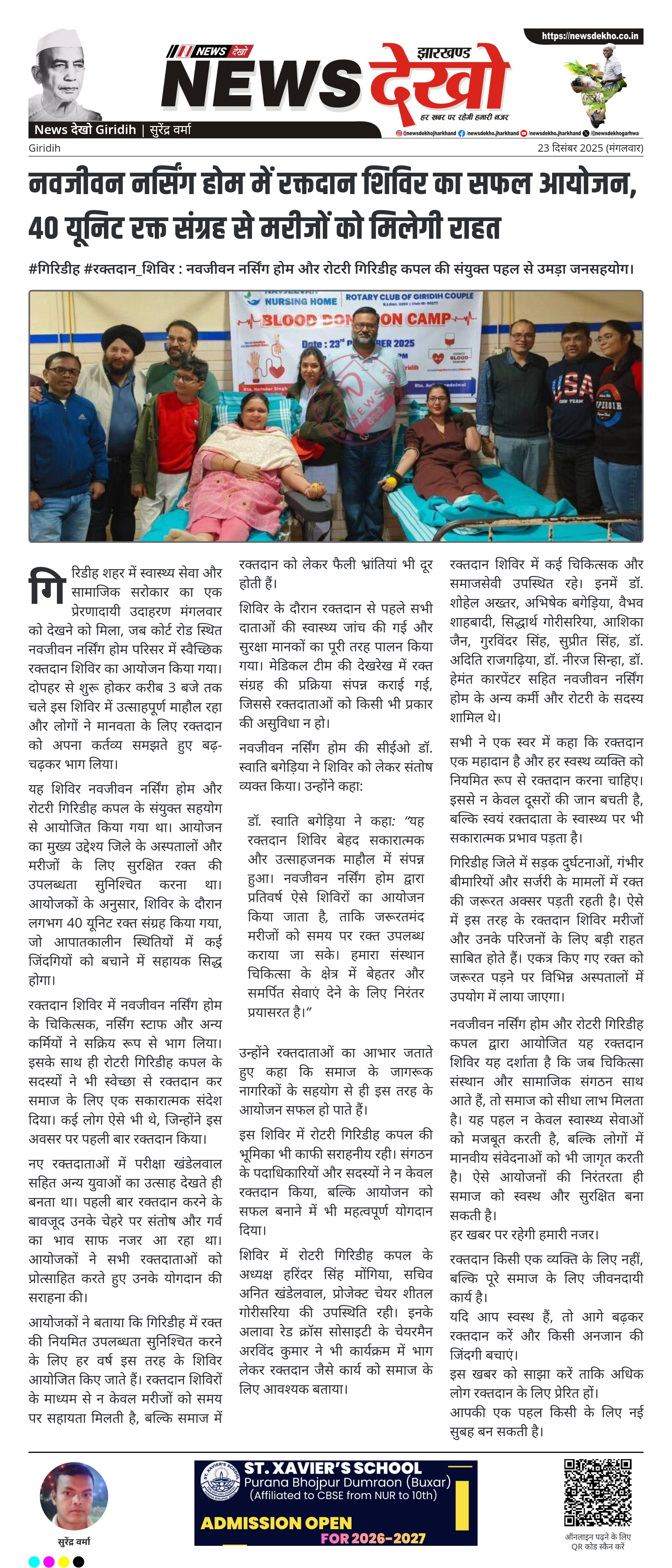 #गिरिडीह #रक्तदान_शिविर : नवजीवन नर्सिंग होम और रोटरी गिरिडीह कपल की संयुक्त पहल से उमड़ा जनसहयोग। नवजीवन नर्सिंग होम, कोर्ट रोड में हुआ रक्तदान शिविर। नवजीवन नर्सिंग होम और रोटरी गिरिडीह कपल की संयुक्त भागीदारी। करीब 40 यूनिट रक्त सफलतापूर्वक संग्रह। पहली बार रक्तदान करने वालों में दिखा विशेष उत्साह। स्वास्थ्य सेवा और सामाजिक जिम्मेदारी का दिया संदेश। गिरिडीह शहर में स्वास्थ्य सेवा और सामाजिक सरोकार का एक प्रेरणादायी उदाहरण मंगलवार को देखने को मिला, जब कोर्ट रोड स्थित नवजीवन…