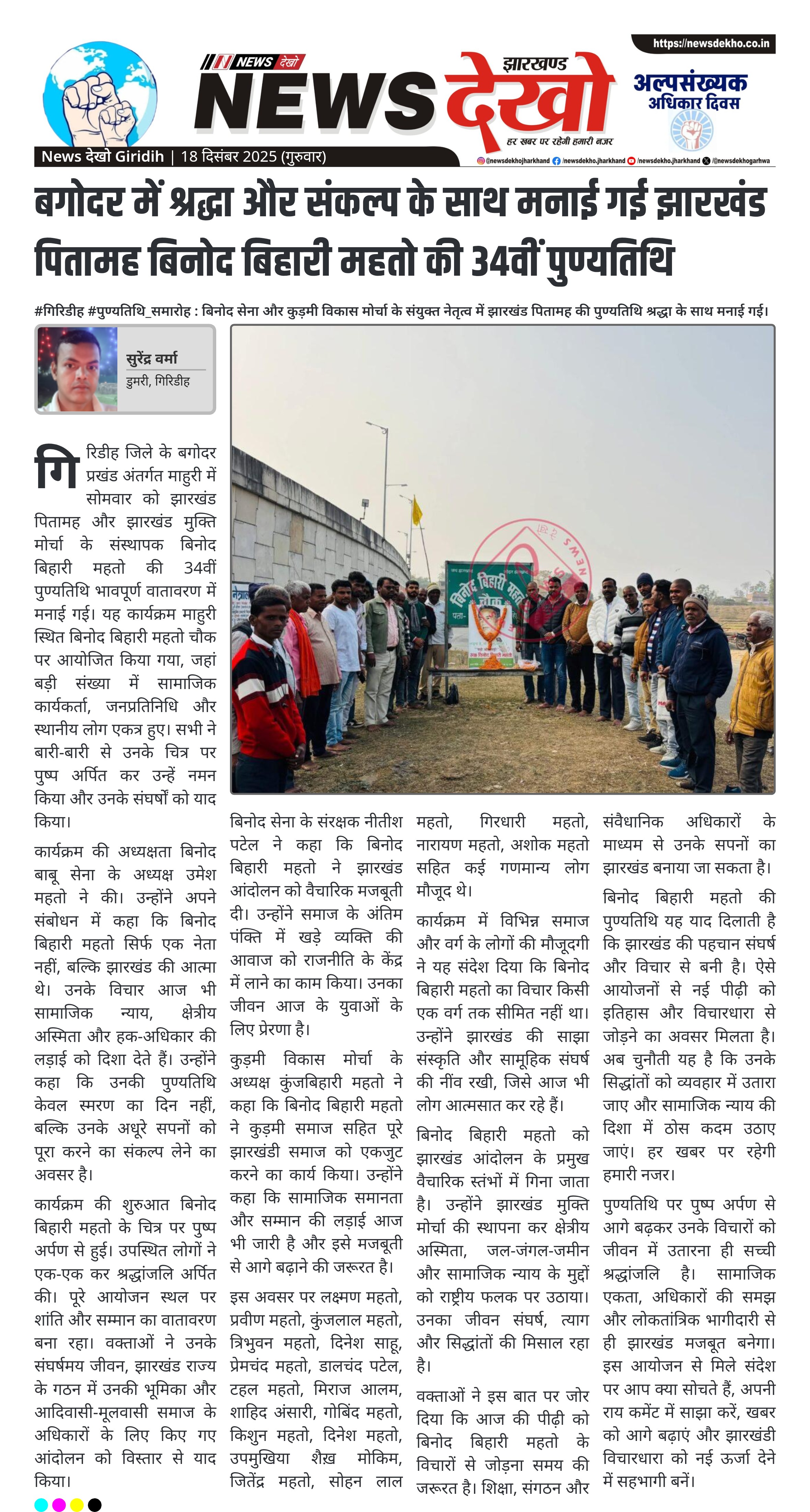 #गिरिडीह #पुण्यतिथि_समारोह : बिनोद सेना और कुड़मी विकास मोर्चा के संयुक्त नेतृत्व में झारखंड पितामह की पुण्यतिथि श्रद्धा के साथ मनाई गई। बिनोद बिहारी महतो चौक, माहुरी में हुआ आयोजन। बिनोद सेना और कुड़मी विकास मोर्चा के संयुक्त तत्वावधान में कार्यक्रम। अध्यक्षता उमेश महतो, अध्यक्ष बिनोद बाबू सेना। 34वीं पुण्यतिथि पर पुष्प अर्पण और श्रद्धांजलि। सामाजिक, राजनीतिक और पंचायत प्रतिनिधियों की सहभागिता। झारखंड आंदोलन की विरासत को आगे बढ़ाने का संकल्प। गिरिडीह जिले के बगोदर प्रखंड अंतर्गत माहुरी में सोमवार…
