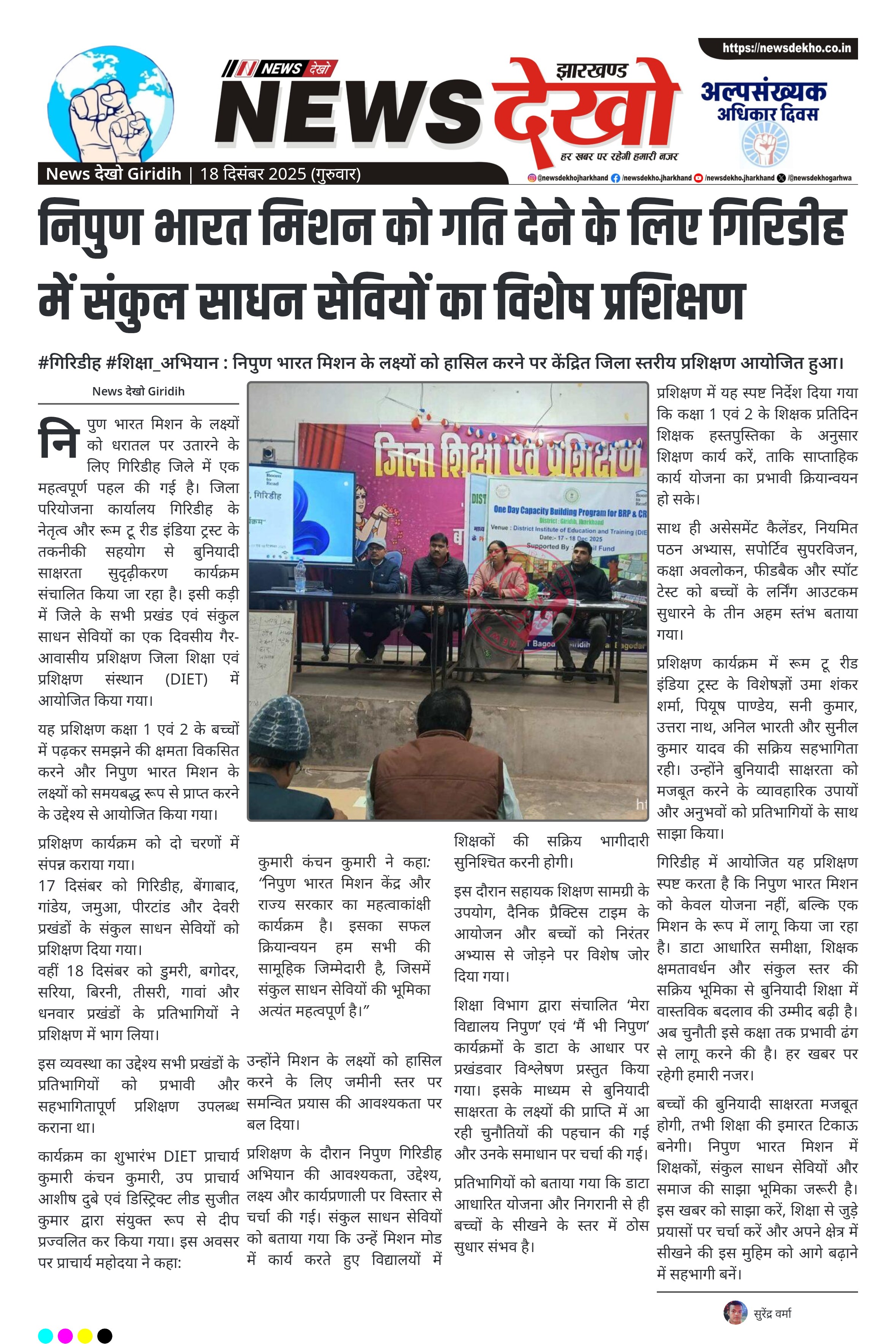 #गिरिडीह #शिक्षा_अभियान : निपुण भारत मिशन के लक्ष्यों को हासिल करने पर केंद्रित जिला स्तरीय प्रशिक्षण आयोजित हुआ। निपुण भारत मिशन के लिए संकुल साधन सेवियों का जिला स्तरीय प्रशिक्षण। DIET गिरिडीह में 17 और 18 दिसंबर को दो चरणों में आयोजन। कक्षा 1 एवं 2 के बच्चों की बुनियादी साक्षरता पर फोकस। निपुण गिरिडीह अभियान की रणनीति और लक्ष्यों पर चर्चा। रूम टू रीड इंडिया ट्रस्ट का तकनीकी सहयोग। शिक्षक हस्तपुस्तिका, असेसमेंट कैलेंडर और स्पॉट टेस्ट पर बल। निपुण…