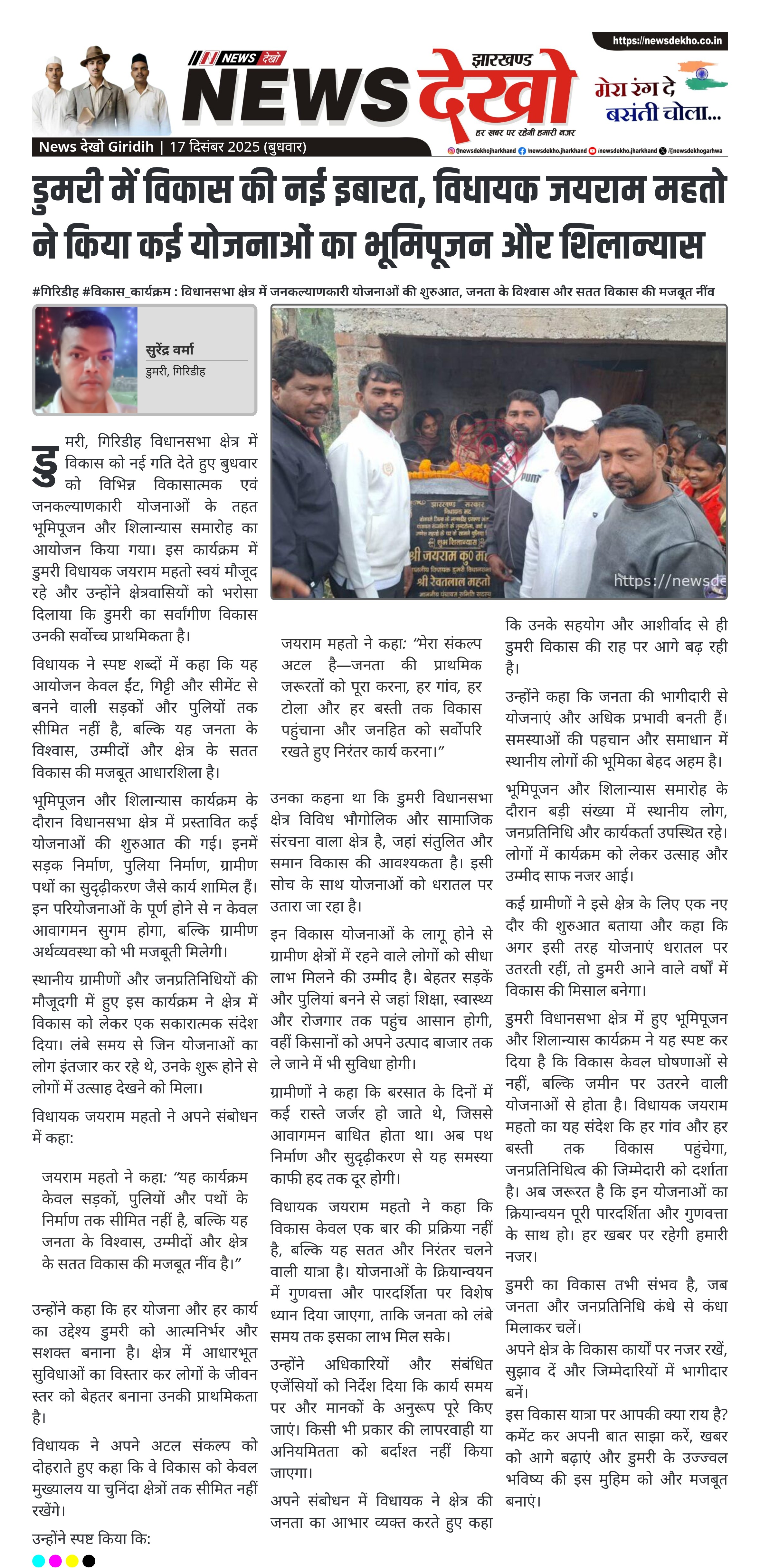 #गिरिडीह #विकास_कार्यक्रम : विधानसभा क्षेत्र में जनकल्याणकारी योजनाओं की शुरुआत, जनता के विश्वास और सतत विकास की मजबूत नींव डुमरी विधायक जयराम महतो की उपस्थिति में विकासात्मक योजनाओं का भूमिपूजन व शिलान्यास। सड़क, पुलिया और पथ निर्माण सहित कई आधारभूत कार्यों की शुरुआत। कार्यक्रम को विधायक ने बताया जनता की उम्मीदों और विश्वास की नींव। हर गांव, टोला और बस्ती तक विकास पहुंचाने का संकल्प दोहराया। जनहित को सर्वोपरि रखते हुए निरंतर कार्य करने का आश्वासन। डुमरी, गिरिडीह विधानसभा क्षेत्र…