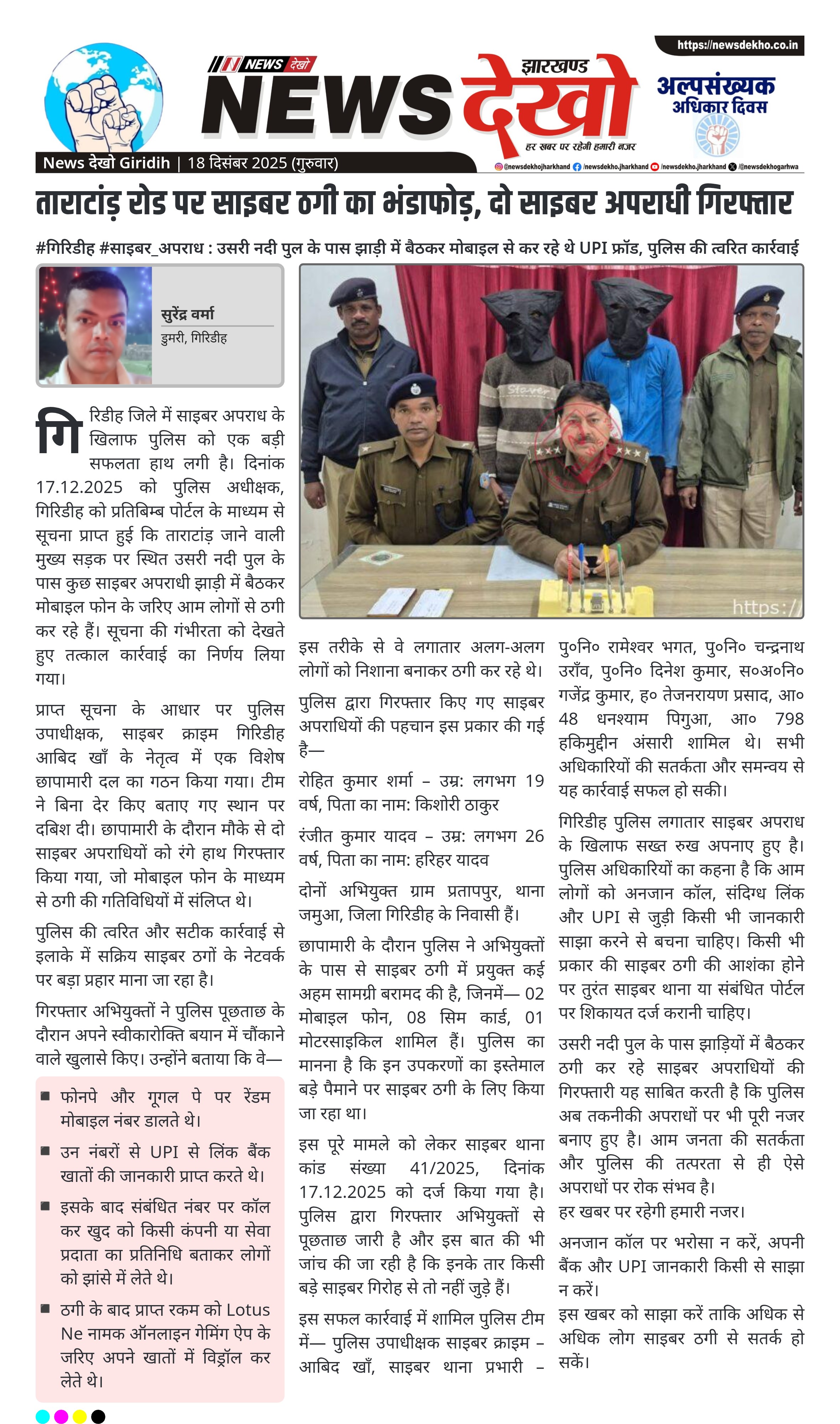 #गिरिडीह #साइबर_अपराध : उसरी नदी पुल के पास झाड़ी में बैठकर मोबाइल से कर रहे थे UPI फ्रॉड, पुलिस की त्वरित कार्रवाई पुलिस अधीक्षक गिरिडीह को प्रतिबिम्ब पोर्टल से मिली थी साइबर ठगी की गुप्त सूचना। उसरी नदी पुल, ताराटांड़ मुख्य सड़क के पास झाड़ी में सक्रिय थे साइबर अपराधी। डीएसपी साइबर क्राइम आबिद खाँ के नेतृत्व में गठित टीम ने की छापामारी। दो साइबर अपराधी गिरफ्तार, 02 मोबाइल, 08 सिम कार्ड और 01 मोटरसाइकिल बरामद। फोनपे और गूगल पे…