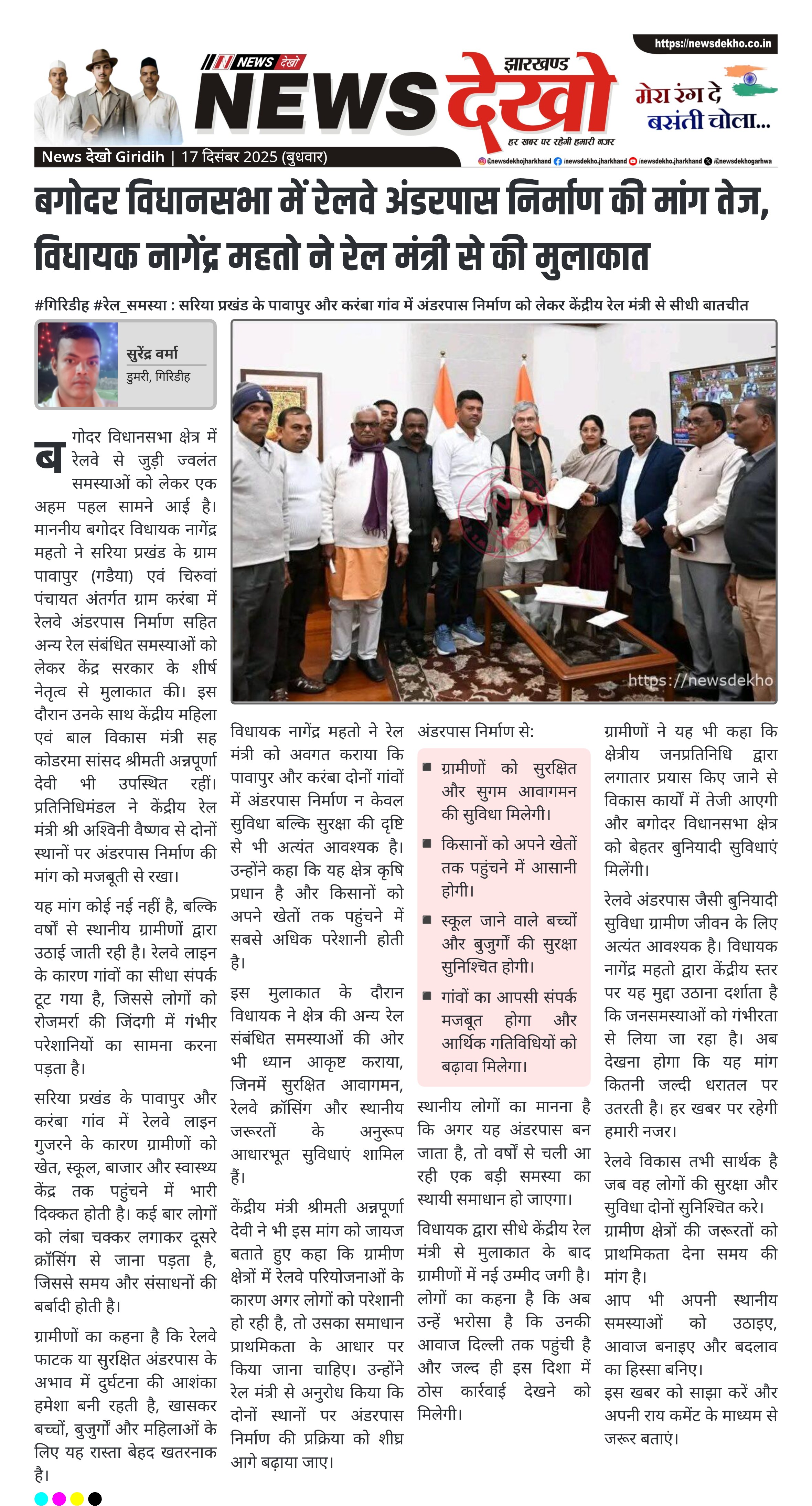 #गिरिडीह #रेल_समस्या : सरिया प्रखंड के पावापुर और करंबा गांव में अंडरपास निर्माण को लेकर केंद्रीय रेल मंत्री से सीधी बातचीत बगोदर विधायक नागेंद्र महतो ने रेलवे अंडरपास निर्माण को लेकर केंद्र सरकार से किया आग्रह। केंद्रीय महिला एवं बाल विकास मंत्री सह कोडरमा सांसद अन्नपूर्णा देवी भी रहीं मौजूद। केंद्रीय रेल मंत्री अश्विनी वैष्णव से हुई महत्वपूर्ण मुलाकात। सरिया प्रखंड के ग्राम पावापुर (गडैया) और करंबा में अंडरपास की वर्षों पुरानी मांग। अंडरपास बनने से ग्रामीणों के आवागमन और…