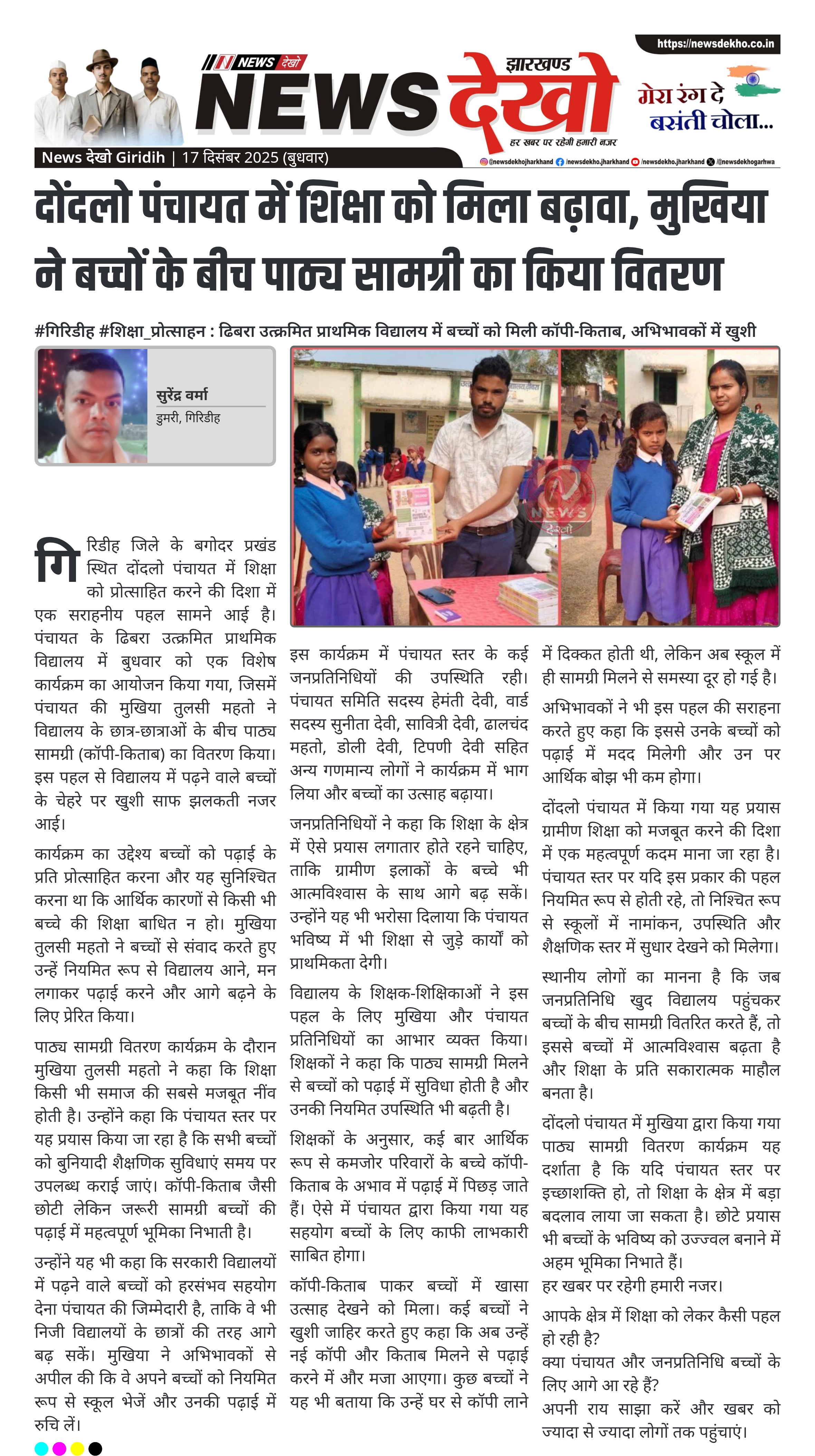 #गिरिडीह #शिक्षा_प्रोत्साहन : ढिबरा उत्क्रमित प्राथमिक विद्यालय में बच्चों को मिली कॉपी-किताब, अभिभावकों में खुशी गिरिडीह जिले के बगोदर प्रखंड अंतर्गत दोंदलो पंचायत के ढिबरा उत्क्रमित प्राथमिक विद्यालय में कार्यक्रम आयोजित। मुखिया तुलसी महतो ने छात्र-छात्राओं के बीच कॉपी और किताबों का वितरण किया। कार्यक्रम में पंसस हेमंती देवी, वार्ड सदस्य सुनीता देवी, सावित्री देवी सहित कई जनप्रतिनिधि उपस्थित। विद्यालय के शिक्षक-शिक्षिकाओं की भी सक्रिय भागीदारी रही। शिक्षा के प्रति बच्चों में उत्साह और अभिभावकों में संतोष का माहौल। गिरिडीह…