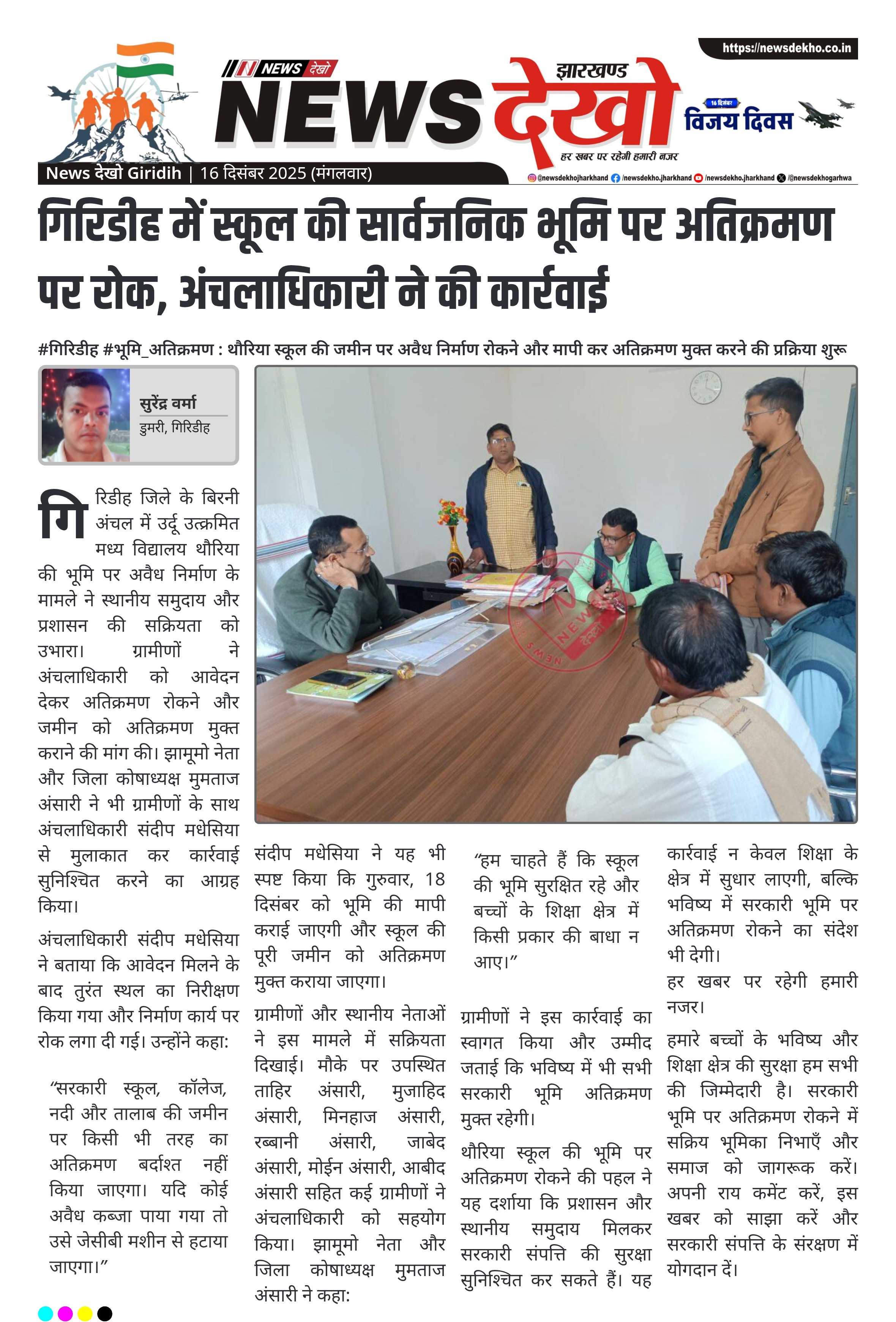 #गिरिडीह #भूमि_अतिक्रमण : थौरिया स्कूल की जमीन पर अवैध निर्माण रोकने और मापी कर अतिक्रमण मुक्त करने की प्रक्रिया शुरू उर्दू उत्क्रमित मध्य विद्यालय थौरिया की सार्वजनिक भूमि पर अवैध निर्माण का मामला सामने आया। ग्रामीणों की शिकायत पर झामूमो नेता मुमताज अंसारी ने अंचलाधिकारी संदीप मधेसिया से मिलकर कार्रवाई की मांग की। अंचलाधिकारी ने स्थल पर जाकर निर्माण कार्य पर रोक लगाई और गुरुवार, 18 दिसंबर को भूमि की मापी कराने का निर्णय लिया। अंचलाधिकारी ने स्पष्ट किया कि…