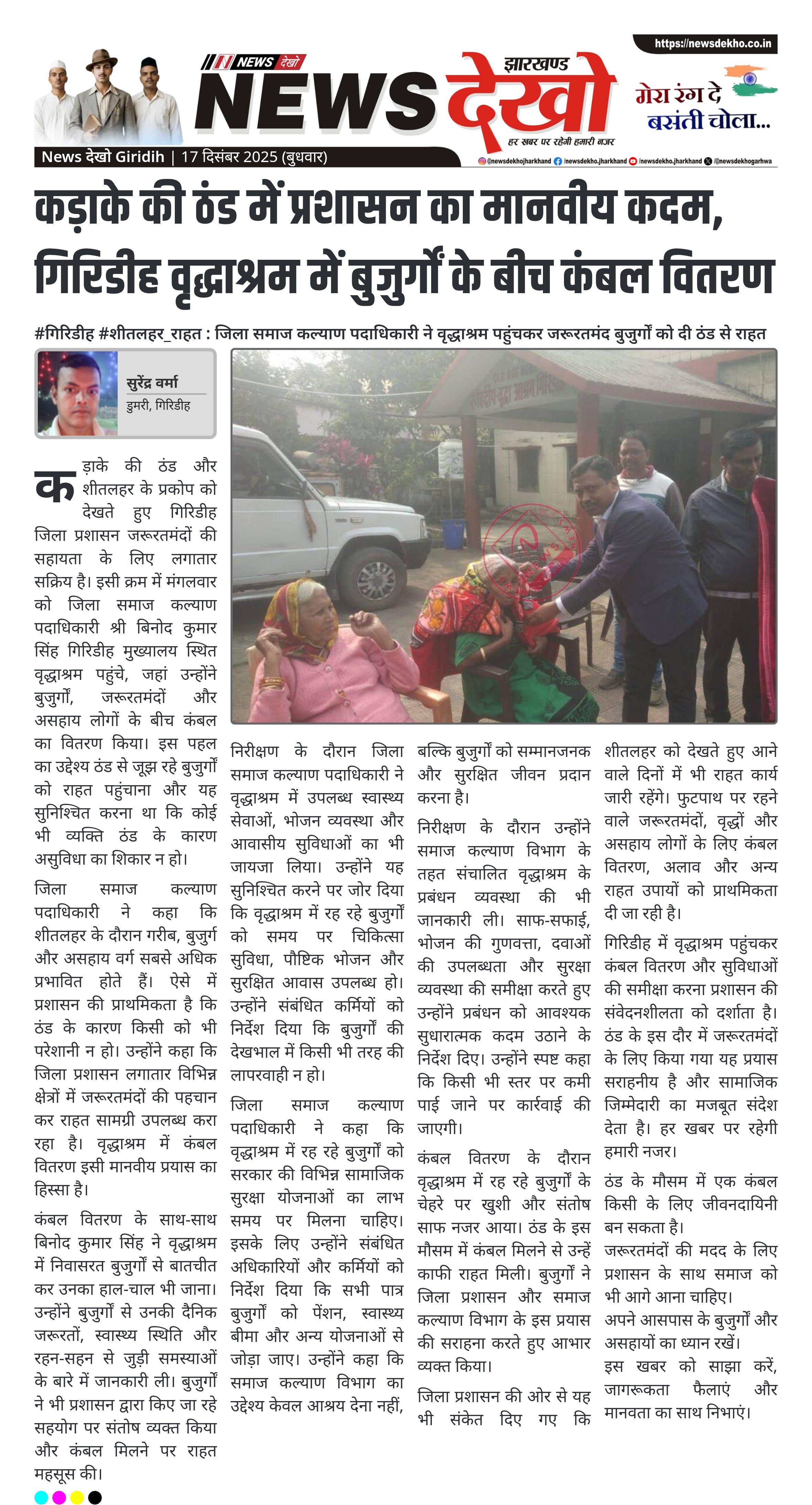 कड़ाके की ठंड में प्रशासन का मानवीय कदम, गिरिडीह वृद्धाश्रम में बुजुर्गों के बीच कंबल वितरण