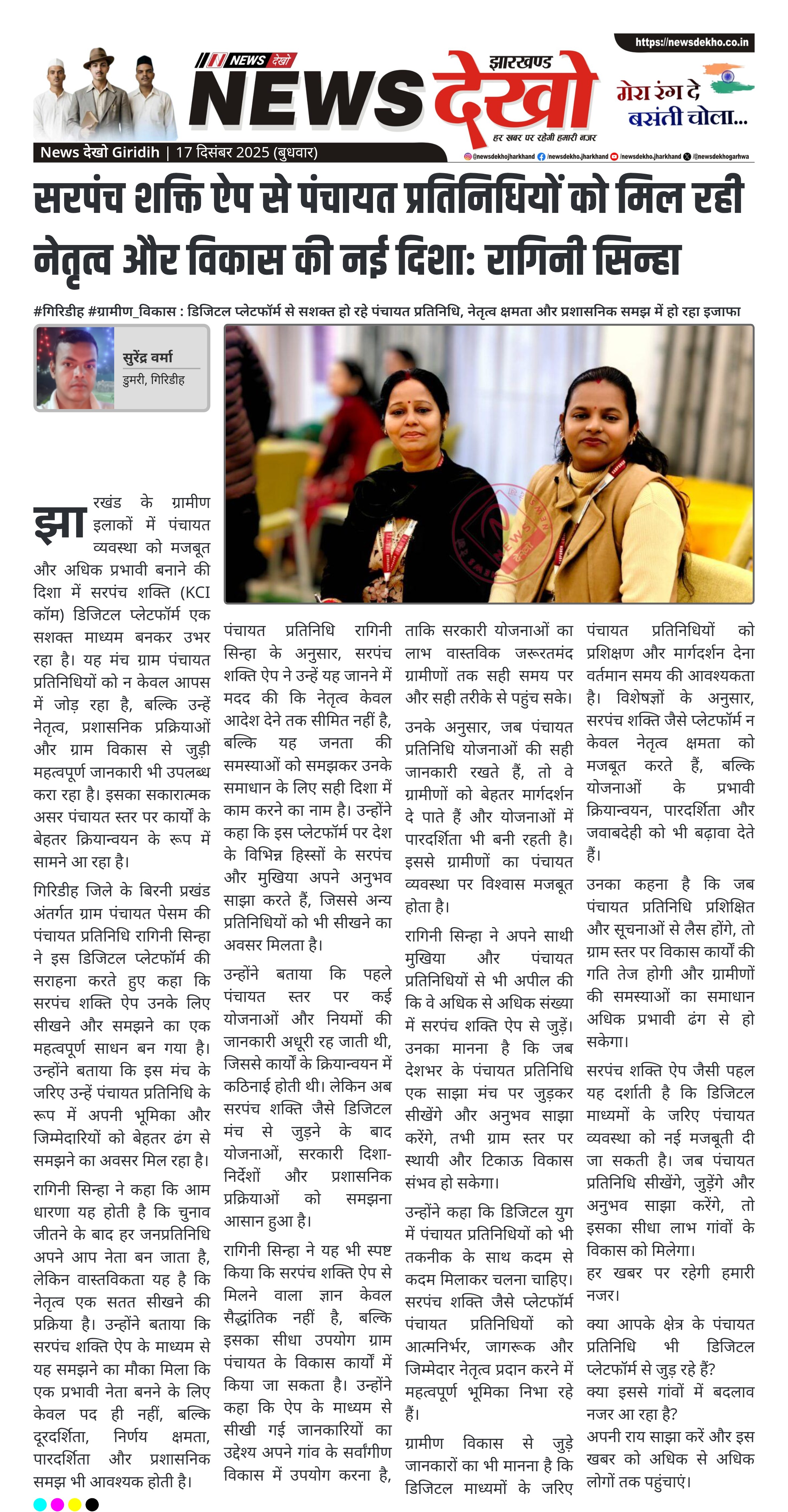 #गिरिडीह #ग्रामीण_विकास : डिजिटल प्लेटफॉर्म से सशक्त हो रहे पंचायत प्रतिनिधि, नेतृत्व क्षमता और प्रशासनिक समझ में हो रहा इजाफा झारखंड के ग्रामीण क्षेत्रों में पंचायत प्रतिनिधियों को सशक्त बना रहा सरपंच शक्ति (KCI कॉम) डिजिटल प्लेटफॉर्म। ग्राम पंचायत पेसम, प्रखंड बिरनी, जिला गिरिडीह की पंचायत प्रतिनिधि रागिनी सिन्हा ने ऐप को बताया अत्यंत उपयोगी। नेतृत्व, प्रशासन, योजनाओं और ग्राम विकास से जुड़ी व्यावहारिक जानकारियाँ मिल रहीं। देशभर के सरपंच और मुखिया एक साझा मंच पर आपस में जुड़ रहे…