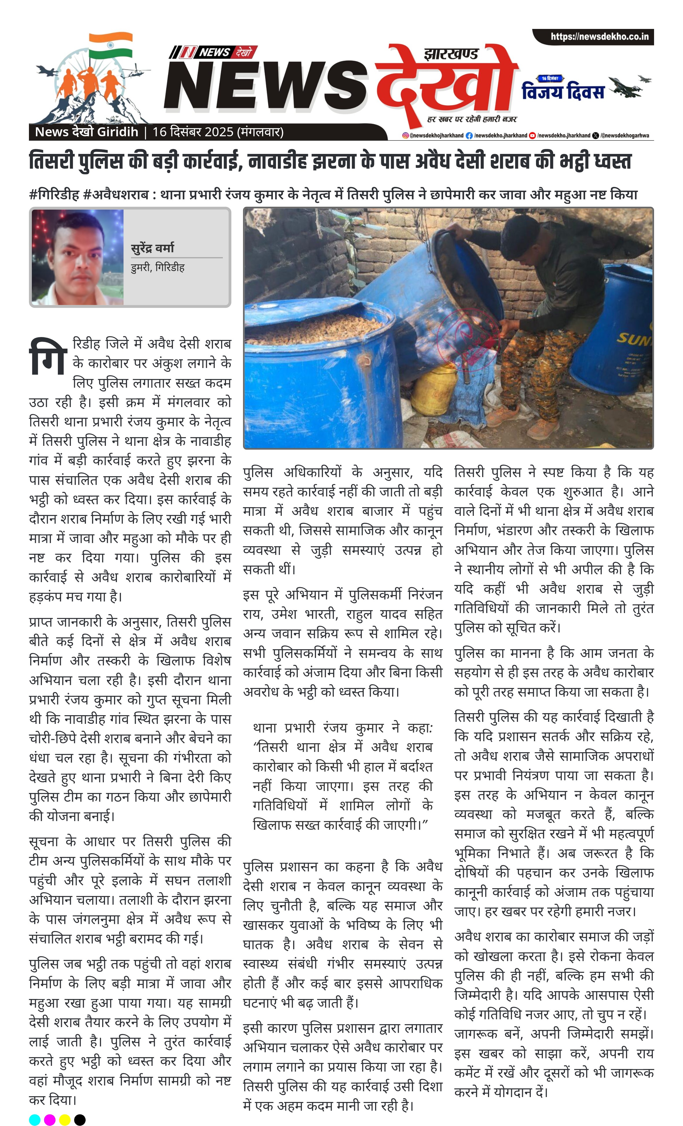 #गिरिडीह #अवैधशराब : थाना प्रभारी रंजय कुमार के नेतृत्व में तिसरी पुलिस ने छापेमारी कर जावा और महुआ नष्ट किया गिरिडीह जिले के तिसरी थाना क्षेत्र में अवैध देसी शराब के खिलाफ बड़ी कार्रवाई। नावाडीह गांव के झरना के पास संचालित अवैध शराब भट्ठी पर छापेमारी। थाना प्रभारी रंजय कुमार के नेतृत्व में पुलिस टीम ने भट्ठी को किया ध्वस्त। मौके से शराब निर्माण में प्रयुक्त भारी मात्रा में जावा और महुआ नष्ट। अभियान में निरंजन राय, उमेश भारती, राहुल…
