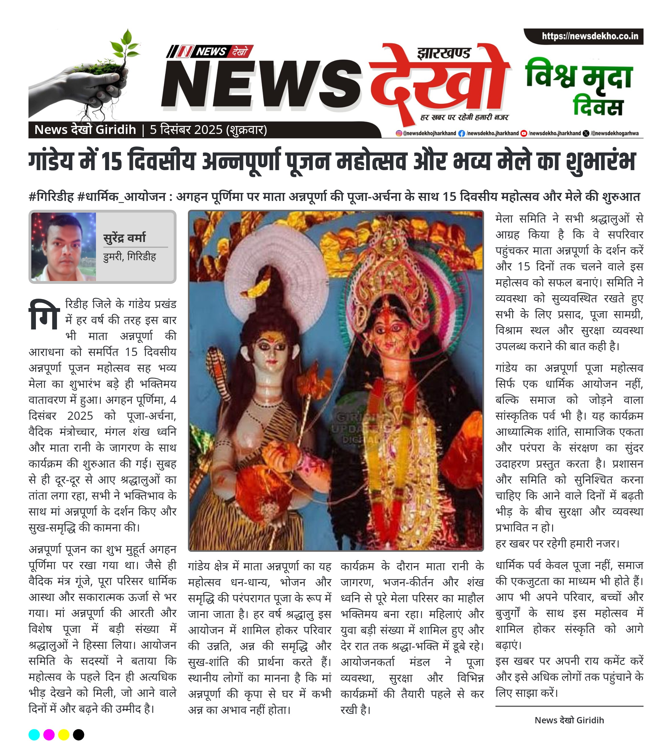 #गिरिडीह #धार्मिक_आयोजन : अगहन पूर्णिमा पर माता अन्नपूर्णा की पूजा-अर्चना के साथ 15 दिवसीय महोत्सव और मेले की शुरुआत गिरिडीह जिले के गांडेय में 15 दिवसीय अन्नपूर्णा पूजन महोत्सव का शुभारंभ। अगहन पूर्णिमा, 4 दिसंबर 2025 को वैदिक मंत्रोच्चार के बीच हुई शुरुआत। शंख ध्वनि, जागरण और पूजा-अर्चना के साथ माता अन्नपूर्णा की आराधना। क्षेत्रभर से पहुंचे श्रद्धालुओं की भारी भीड़ ने लिया आशीर्वाद। समिति ने श्रद्धालुओं से सपरिवार दर्शन करने की अपील की। गिरिडीह जिले के गांडेय प्रखंड में…