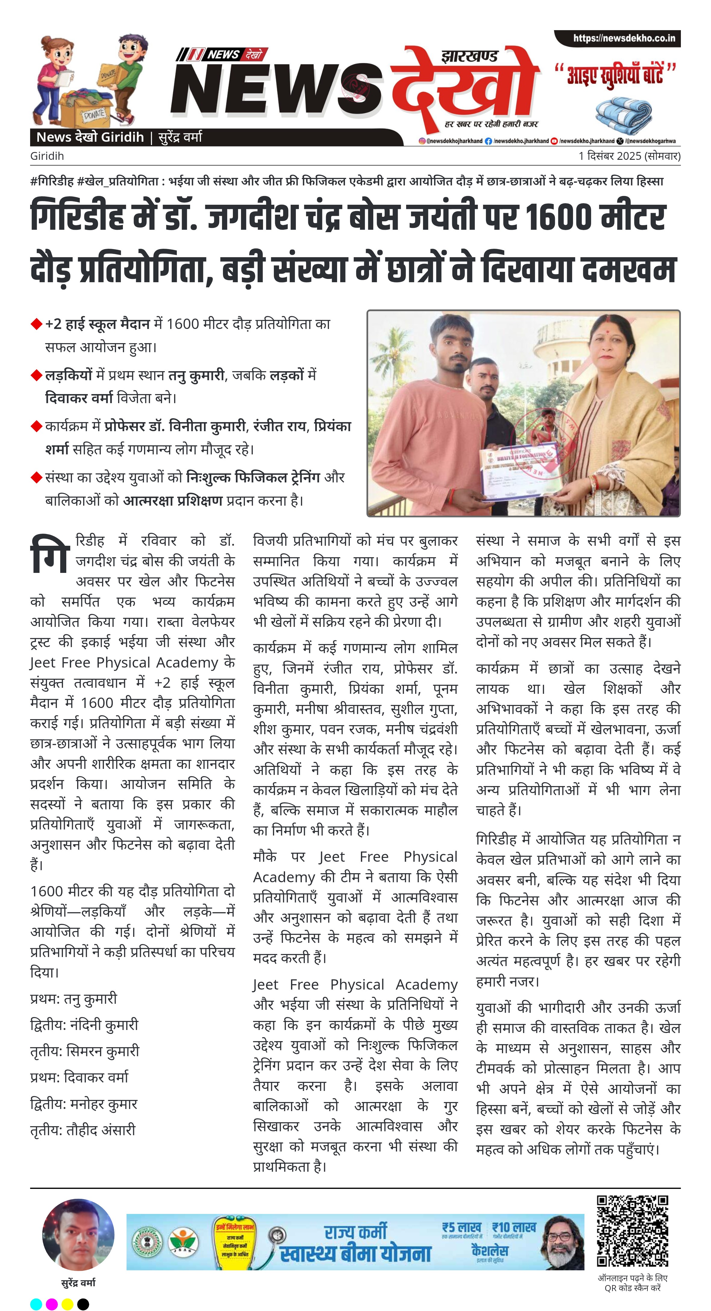#गिरिडीह #खेल_प्रतियोगिता : भईया जी संस्था और जीत फ्री फिजिकल एकेडमी द्वारा आयोजित दौड़ में छात्र-छात्राओं ने बढ़-चढ़कर लिया हिस्सा +2 हाई स्कूल मैदान में 1600 मीटर दौड़ प्रतियोगिता का सफल आयोजन हुआ। कार्यक्रम का आयोजन भईया जी संस्था (राब्ता वेलफेयर ट्रस्ट) और Jeet Free Physical Academy ने संयुक्त रूप से किया। लड़कियों में प्रथम स्थान तनु कुमारी, जबकि लड़कों में दिवाकर वर्मा विजेता बने। कार्यक्रम में प्रोफेसर डॉ. विनीता कुमारी, रंजीत राय, प्रियंका शर्मा सहित कई गणमान्य लोग मौजूद…