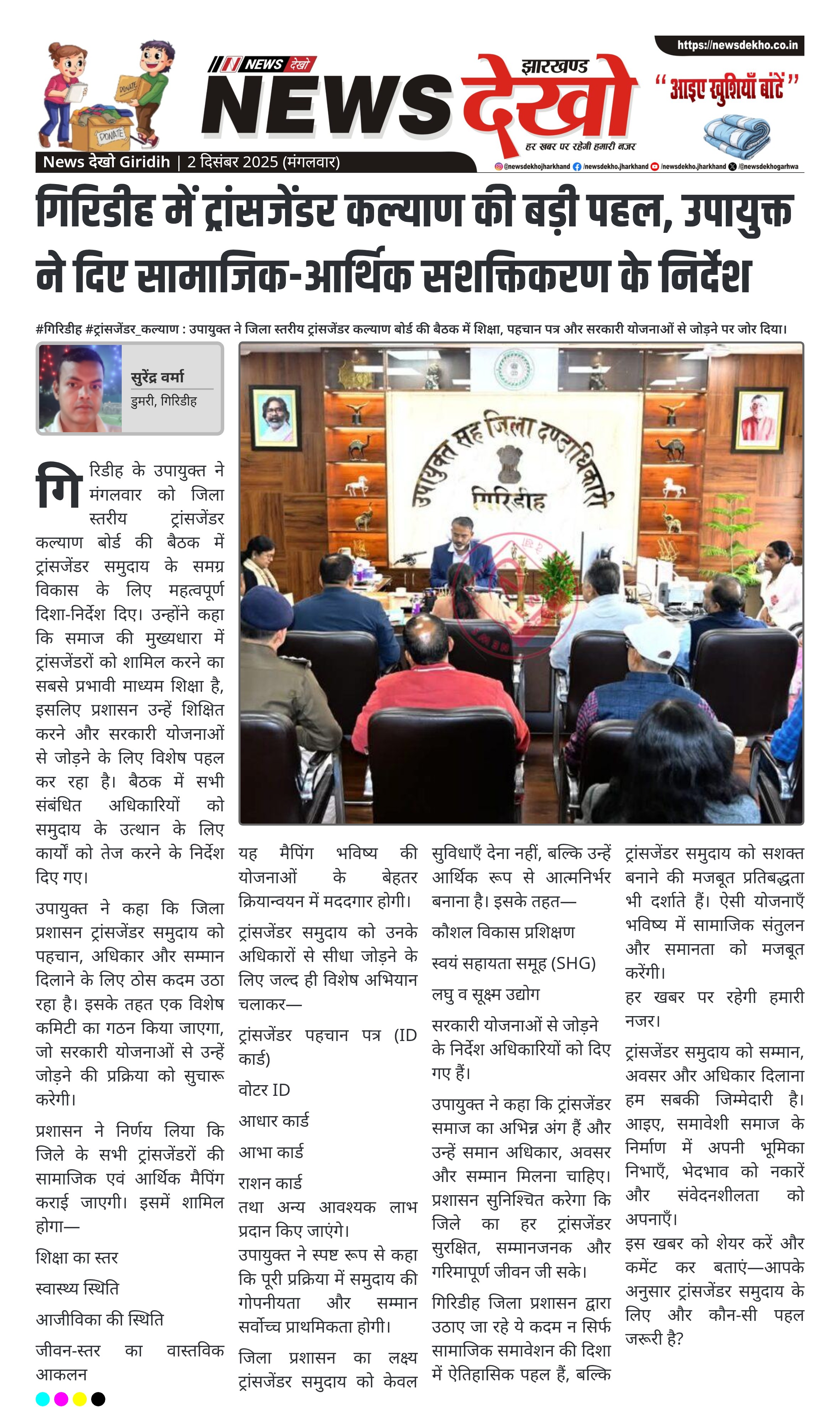 गिरिडीह में ट्रांसजेंडर कल्याण की बड़ी पहल, उपायुक्त ने दिए सामाजिक-आर्थिक सशक्तिकरण के निर्देश