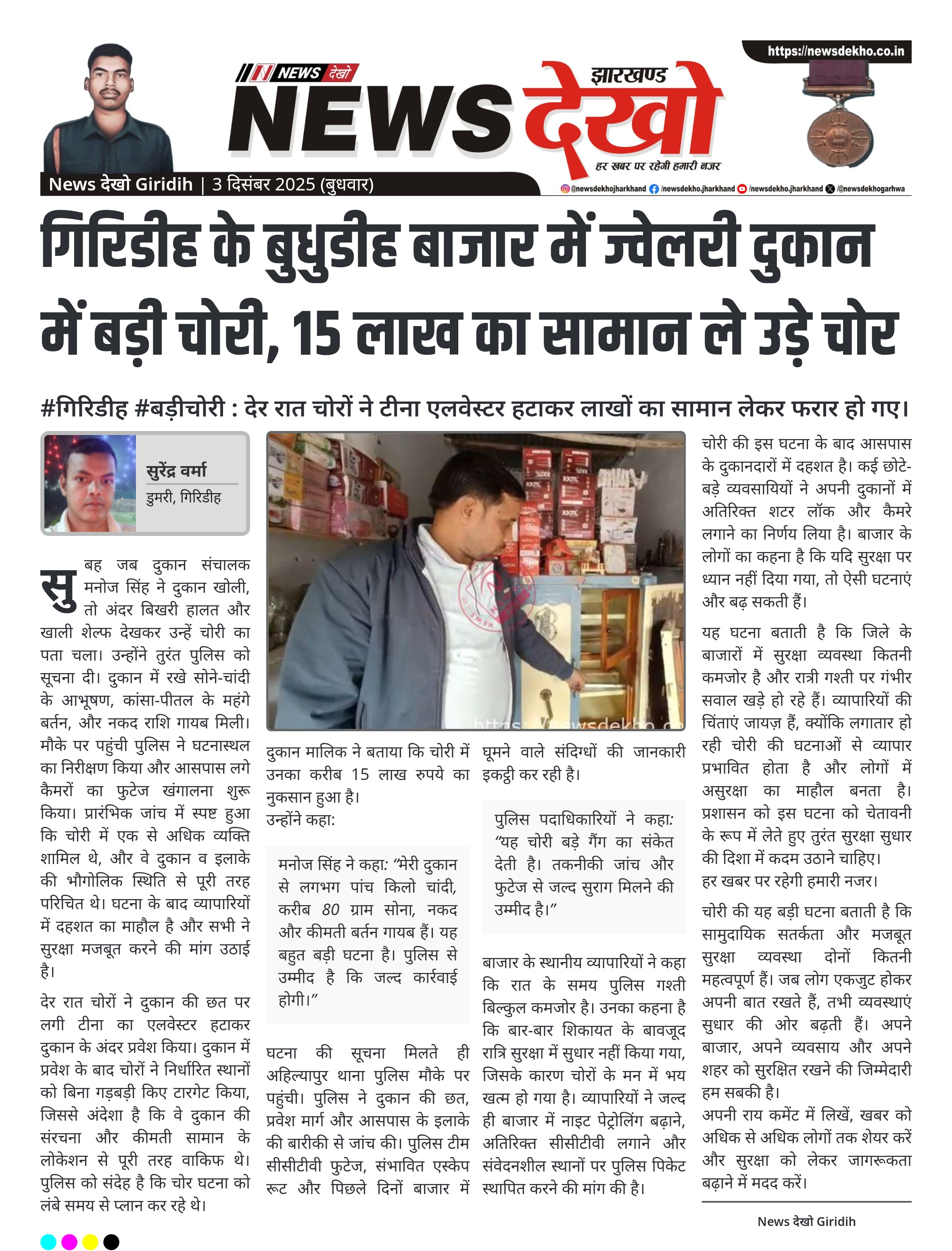 गिरिडीह के बुधुडीह बाजार में ज्वेलरी दुकान में बड़ी चोरी, 15 लाख का सामान ले उड़े चोर