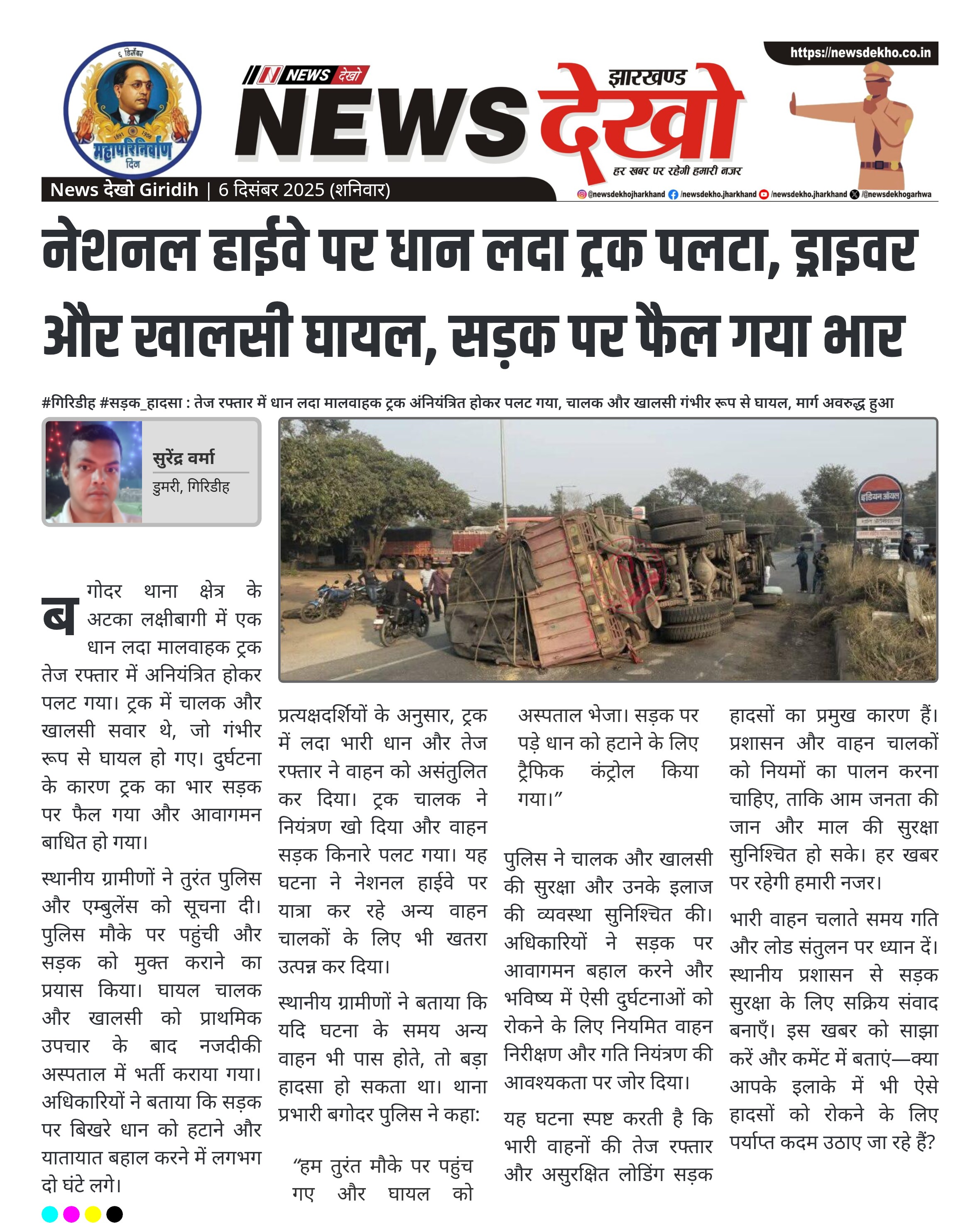 #गिरिडीह #सड़क_हादसा : तेज रफ्तार में धान लदा मालवाहक ट्रक अंनियंत्रित होकर पलट गया, चालक और खालसी गंभीर रूप से घायल, मार्ग अवरुद्ध हुआ बगोदर थाना क्षेत्र के अटका लक्षीबागी में ट्रक पलटा। ट्रक चालक और खालसी गंभीर रूप से घायल। ट्रक में लदे धान का भार सड़क पर बिखर गया, जिससे मार्ग अवरुद्ध। स्थानीय लोगों ने पुलिस और एम्बुलेंस को तत्काल सूचना दी। घायल दोनों को नजदीकी अस्पताल में भर्ती कराया गया। बगोदर थाना क्षेत्र के अटका लक्षीबागी में…