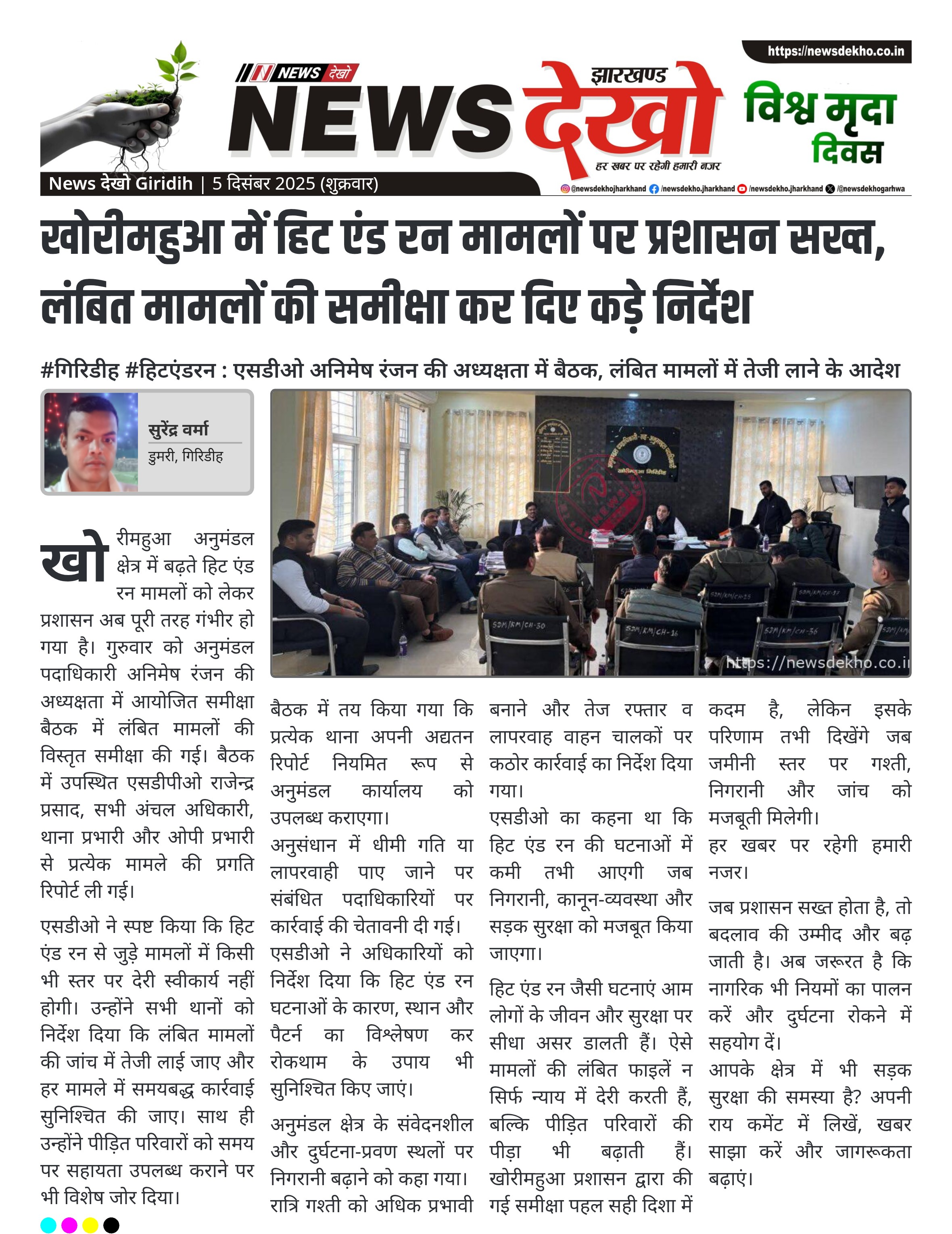 #गिरिडीह #हिटएंडरन : एसडीओ अनिमेष रंजन की अध्यक्षता में बैठक, लंबित मामलों में तेजी लाने के आदेश गुरुवार को एसडीओ अनिमेष रंजन की अध्यक्षता में महत्वपूर्ण समीक्षा बैठक आयोजित। एसडीपीओ राजेन्द्र प्रसाद, सभी अंचल अधिकारी, थाना प्रभारी और ओपी प्रभारी हुए शामिल। अनुमंडल क्षेत्र के लंबित हिट एंड रन मामलों की स्थिति पर बिंदुवार चर्चा। जांच की गति बढ़ाने, अद्यतन रिपोर्ट देने और जिम्मेदारी तय करने के निर्देश। संवेदनशील स्थानों पर निगरानी बढ़ाने और रात्रि गश्ती को सुदृढ़ करने का…