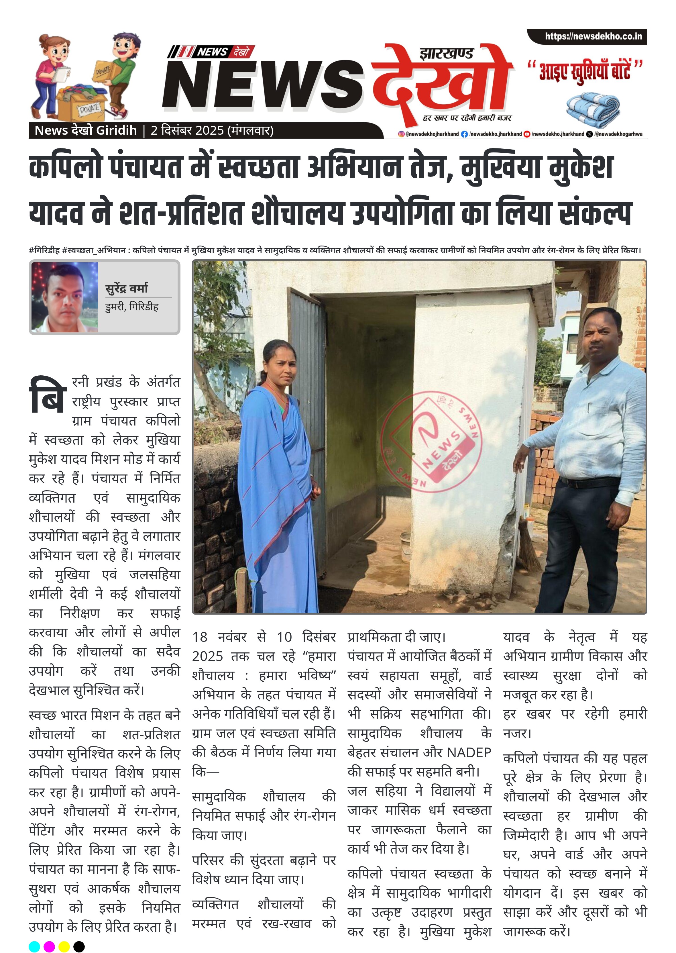 #गिरिडीह #स्वच्छता_अभियान : कपिलो पंचायत में मुखिया मुकेश यादव ने सामुदायिक व व्यक्तिगत शौचालयों की सफाई करवाकर ग्रामीणों को नियमित उपयोग और रंग-रोगन के लिए प्रेरित किया। कपिलो पंचायत में व्यापक स्वच्छता अभियान लगातार जारी। मुखिया मुकेश यादव एवं जलसहिया शर्मीली देवी ने सामुदायिक व व्यक्तिगत शौचालयों का निरीक्षण किया। ग्रामीणों को नियमित उपयोग, सफाई और शौचालय में रंग-रोगन करने की अपील की गई। विश्व शौचालय दिवस अभियान (18 नवंबर–10 दिसंबर) के तहत गतिविधियाँ तेज। ग्राम जल एवं स्वच्छता समिति…