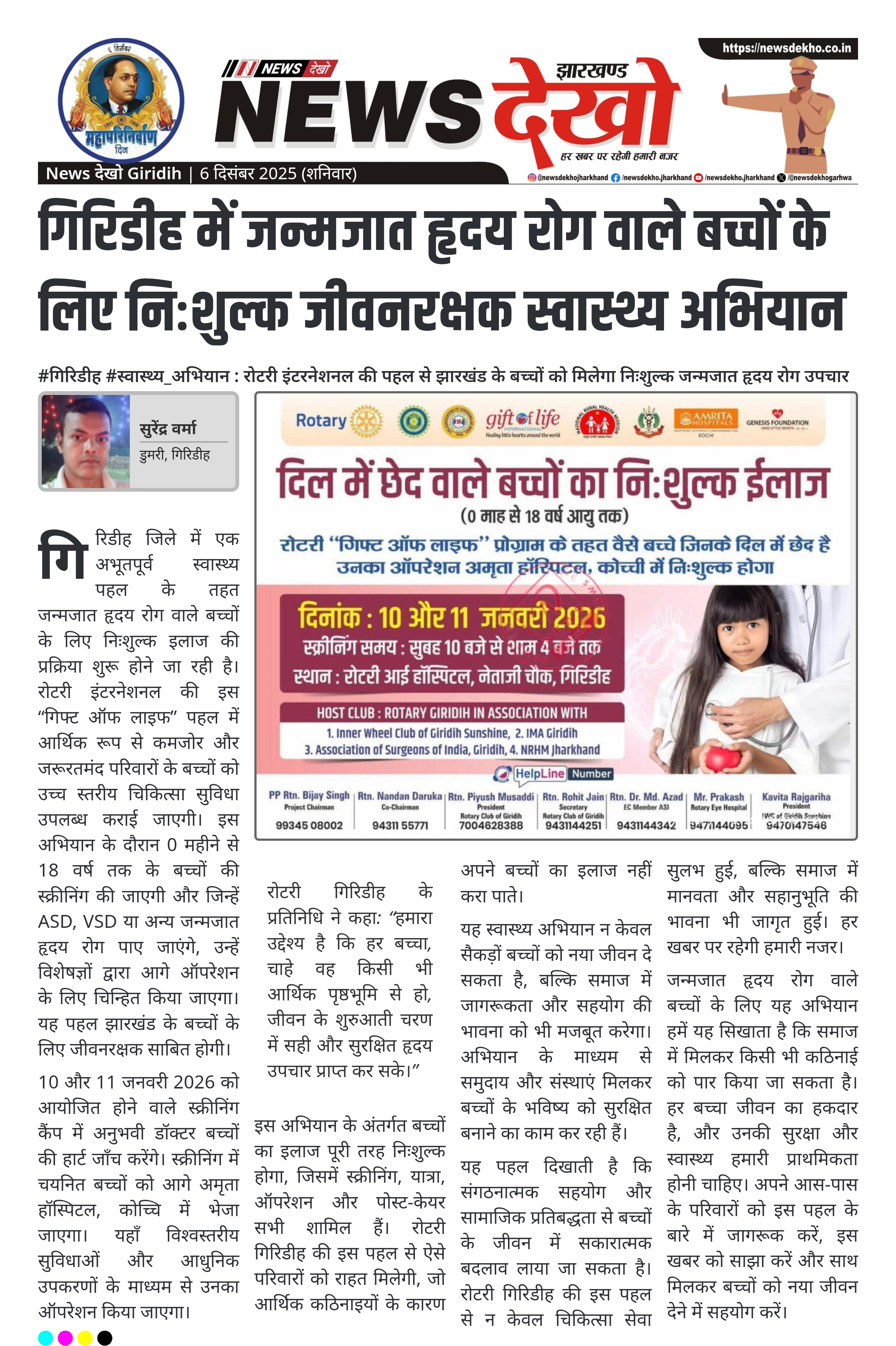 #गिरिडीह #स्वास्थ्य_अभियान : रोटरी इंटरनेशनल की पहल से झारखंड के बच्चों को मिलेगा निःशुल्क जन्मजात हृदय रोग उपचार रोटरी गिरिडीह ने झारखंड के बच्चों के लिए “गिफ्ट ऑफ लाइफ” कार्यक्रम के अंतर्गत विशेष स्क्रीनिंग कैंप का आयोजन किया। अभियान का लक्ष्य 0 महीने से 18 वर्ष तक के बच्चों का निःशुल्क इलाज और ऑपरेशन सुनिश्चित करना। स्क्रीनिंग कैंप 10 और 11 जनवरी 2026, सुबह 10:00 बजे से शाम 4:00 बजे तक, रोटरी आई हॉस्पिटल, नेताजी चौक, गिरिडीह में आयोजित होगा।…