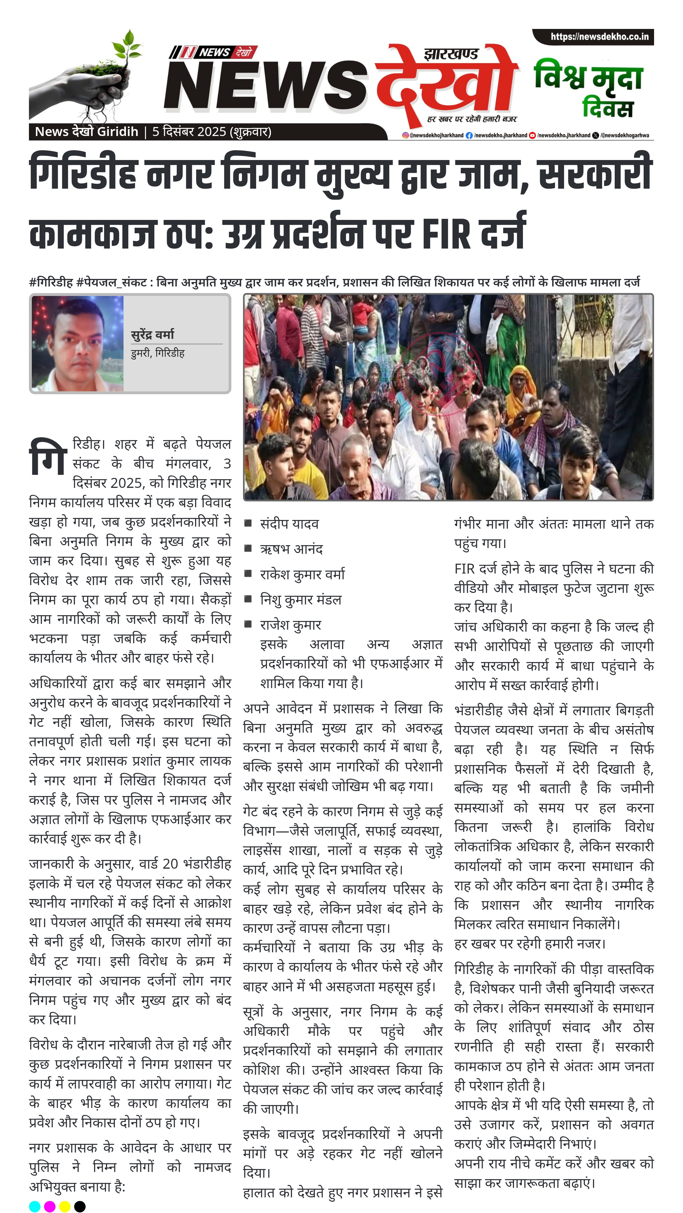 #गिरिडीह #पेयजल_संकट : बिना अनुमति मुख्य द्वार जाम कर प्रदर्शन, प्रशासन की लिखित शिकायत पर कई लोगों के खिलाफ मामला दर्ज 3 दिसंबर को गिरिडीह नगर निगम कार्यालय का मुख्य द्वार जाम, पूरे दिन कामकाज बाधित। नगर प्रशासक प्रशांत कुमार लायक ने थाने में लिखित शिकायत दी। पुलिस ने नामजद और अज्ञात प्रदर्शनकारियों पर FIR दर्ज की। उग्र नारेबाजी, गेट बंद होने से कर्मचारियों व नागरिकों का प्रवेश बाधित। प्रदर्शनकारियों में संदीप यादव, ऋषभ आनंद, राकेश कुमार वर्मा, निशु कुमार…