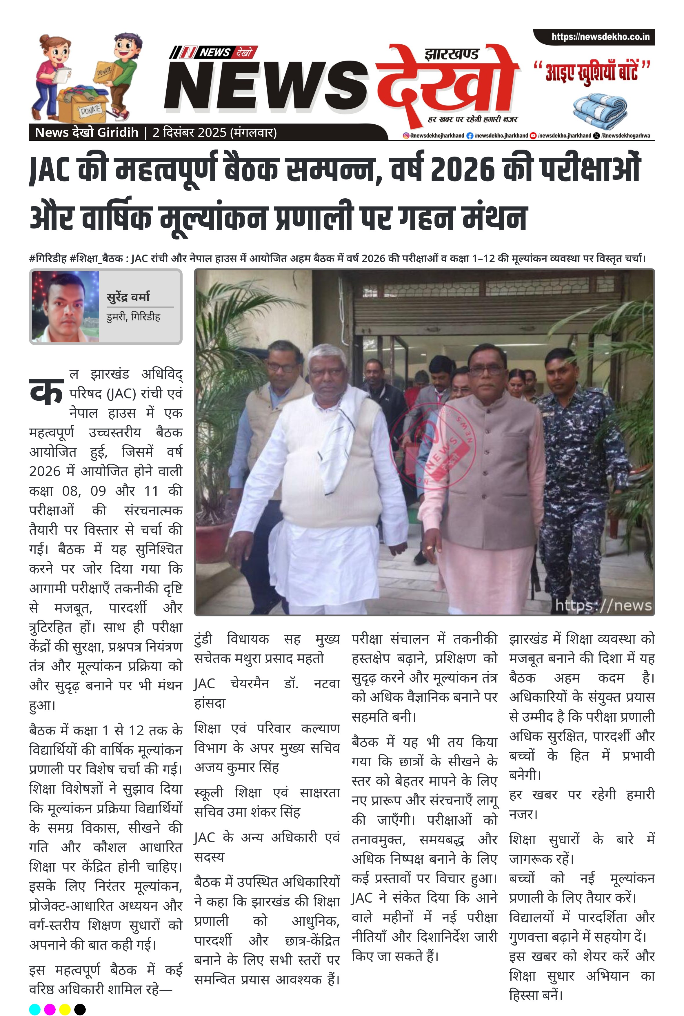 #गिरिडीह #शिक्षा_बैठक : JAC रांची और नेपाल हाउस में आयोजित अहम बैठक में वर्ष 2026 की परीक्षाओं व कक्षा 1–12 की मूल्यांकन व्यवस्था पर विस्तृत चर्चा। JAC रांची एवं नेपाल हाउस में कक्षा 08, 09 और 11 की 2026 परीक्षाओं पर उच्चस्तरीय बैठक। कक्षा 1 से 12 तक के छात्रों की वार्षिक मूल्यांकन प्रणाली में सुधार को लेकर विचार-विमर्श। बैठक में टुंडी विधायक व मुख्य सचेतक मथुरा प्रसाद महतो, JAC चेयरमैन डॉ. नटवा हांसदा उपस्थित रहे। अपर मुख्य सचिव अजय…