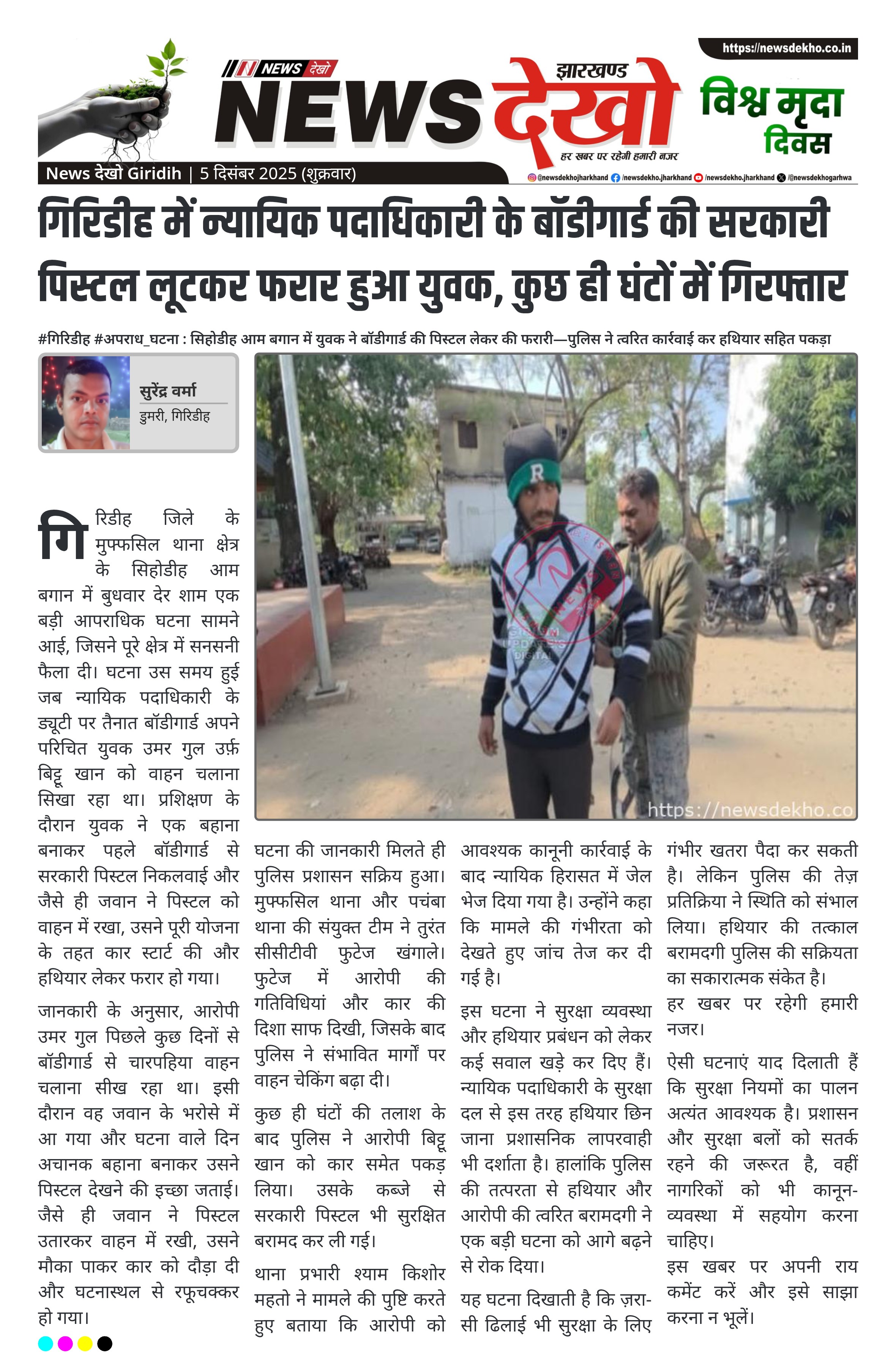 #गिरिडीह #अपराध_घटना : सिहोडीह आम बगान में युवक ने बॉडीगार्ड की पिस्टल लेकर की फरारी—पुलिस ने त्वरित कार्रवाई कर हथियार सहित पकड़ा बुधवार देर शाम सिहोडीह आम बगान, गिरिडीह में सनसनीखेज घटना। न्यायिक पदाधिकारी के बॉडीगार्ड से सरकारी पिस्टल लेकर युवक फरार। आरोपी की पहचान उमर गुल उर्फ़ बिट्टू खान, निवासी मोहनपुर, पचंबा थाना क्षेत्र। आरोपी को बॉडीगार्ड ड्राइविंग प्रशिक्षण दे रहा था। कार सहित हथियार लेकर भागने के बाद पुलिस ने सीसीटीवी से लोकेशन ट्रेस की। कुछ ही घंटों…