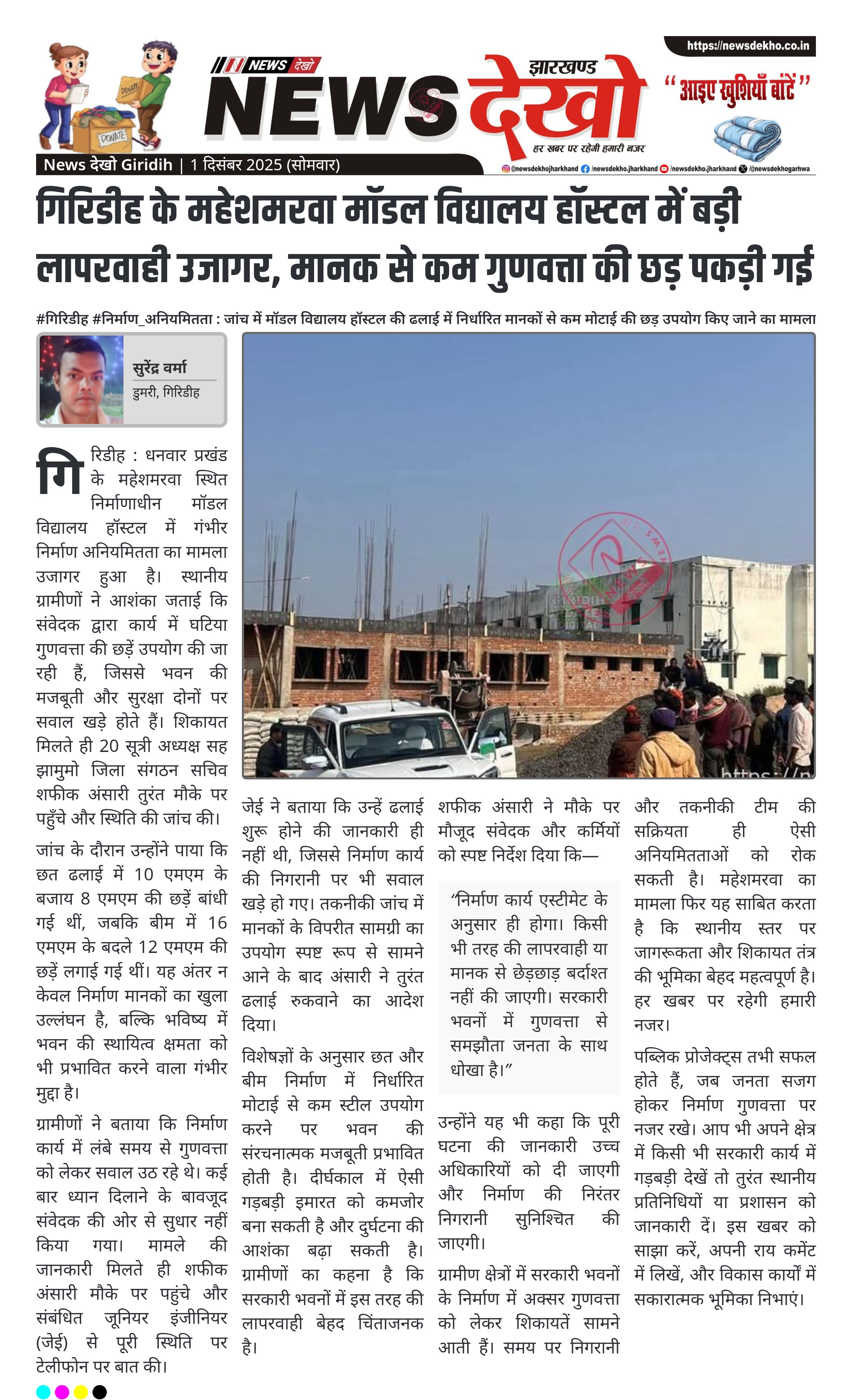 #गिरिडीह #निर्माण_अनियमितता : जांच में मॉडल विद्यालय हॉस्टल की ढलाई में निर्धारित मानकों से कम मोटाई की छड़ उपयोग किए जाने का मामला सामने आया—ढलाई तुरंत रोकी गई। महेशमरवा (धनवार) में निर्माणाधीन मॉडल विद्यालय हॉस्टल में अनियमितता का आरोप। ग्रामीणों ने 20 सूत्री अध्यक्ष शफीक अंसारी को दी शिकायत। छत में 10 एमएम की जगह 8 एमएम, बीम में 16 एमएम की जगह 12 एमएम की छड़ मिली। शफीक अंसारी ने मौके पर पहुँचकर जेई से पूछताछ की। मामले की…