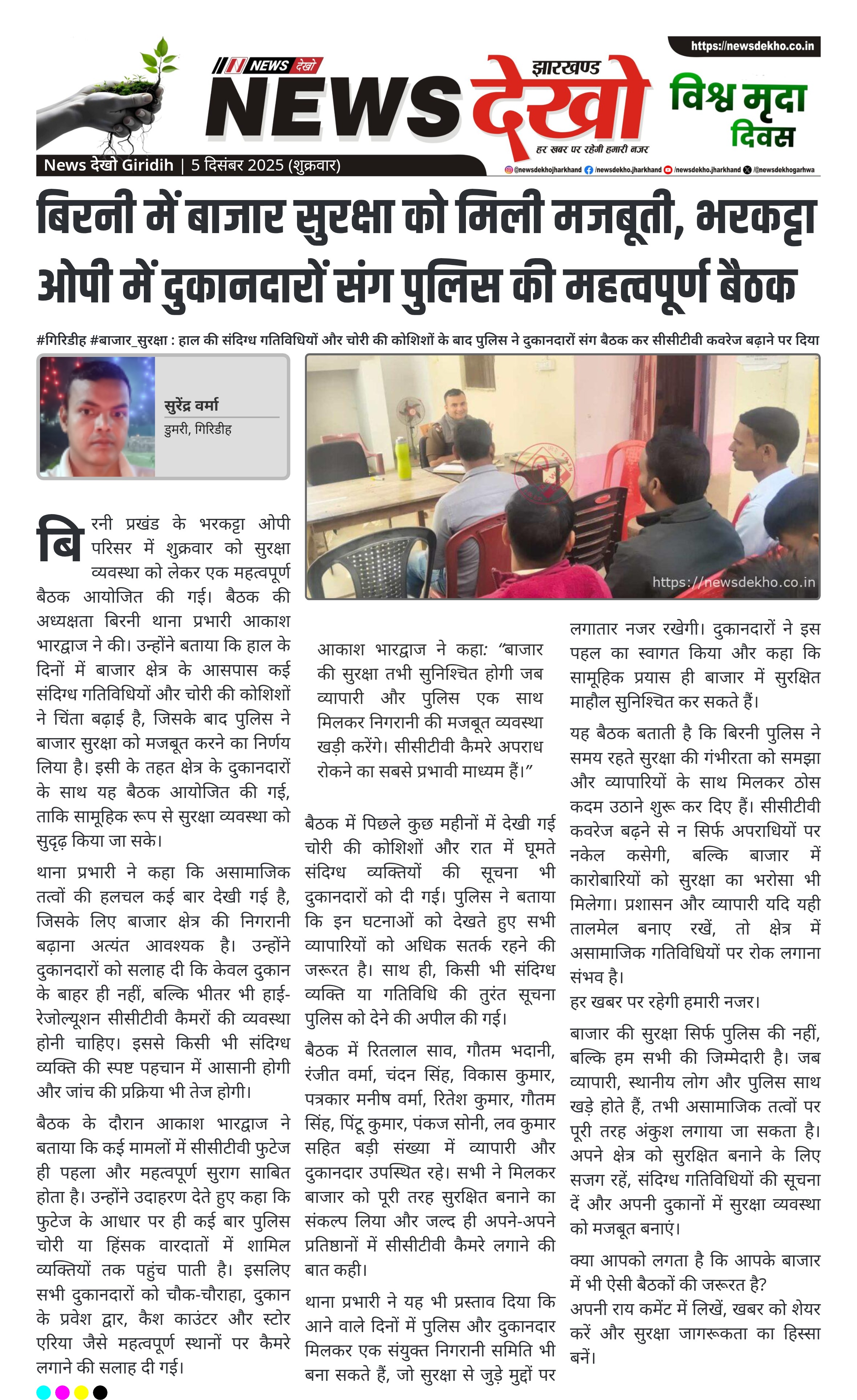 #गिरिडीह #बाजार_सुरक्षा : हाल की संदिग्ध गतिविधियों और चोरी की कोशिशों के बाद पुलिस ने दुकानदारों संग बैठक कर सीसीटीवी कवरेज बढ़ाने पर दिया जोर भरकट्टा ओपी परिसर में बिरनी थाना प्रभारी आकाश भारद्वाज की अध्यक्षता में सुरक्षा को लेकर बैठक हुई। हाल में बाजार क्षेत्र में संदिग्ध गतिविधियों और चोरी की कोशिशों पर गंभीर चर्चा हुई। दुकानदारों को दुकान के बाहर और भीतर उच्च गुणवत्ता वाले सीसीटीवी कैमरे लगाने की सलाह दी गई। पुलिस ने साझा किए पिछले महीनों…