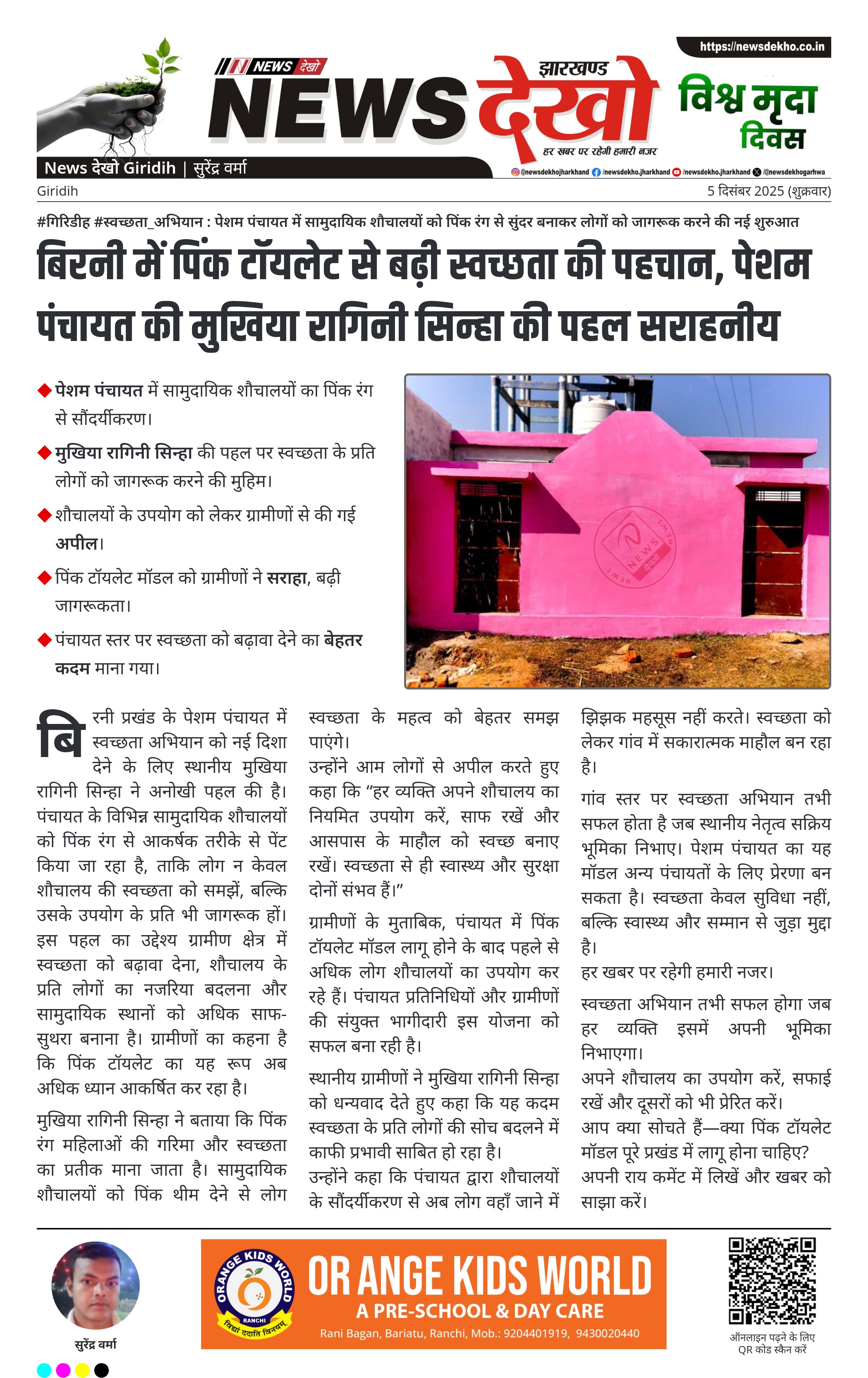 #गिरिडीह #स्वच्छता_अभियान : पेशम पंचायत में सामुदायिक शौचालयों को पिंक रंग से सुंदर बनाकर लोगों को जागरूक करने की नई शुरुआत पेशम पंचायत में सामुदायिक शौचालयों का पिंक रंग से सौंदर्यीकरण। मुखिया रागिनी सिन्हा की पहल पर स्वच्छता के प्रति लोगों को जागरूक करने की मुहिम। शौचालयों के उपयोग को लेकर ग्रामीणों से की गई अपील। पिंक टॉयलेट मॉडल को ग्रामीणों ने सराहा, बढ़ी जागरूकता। पंचायत स्तर पर स्वच्छता को बढ़ावा देने का बेहतर कदम माना गया। बिरनी प्रखंड के…