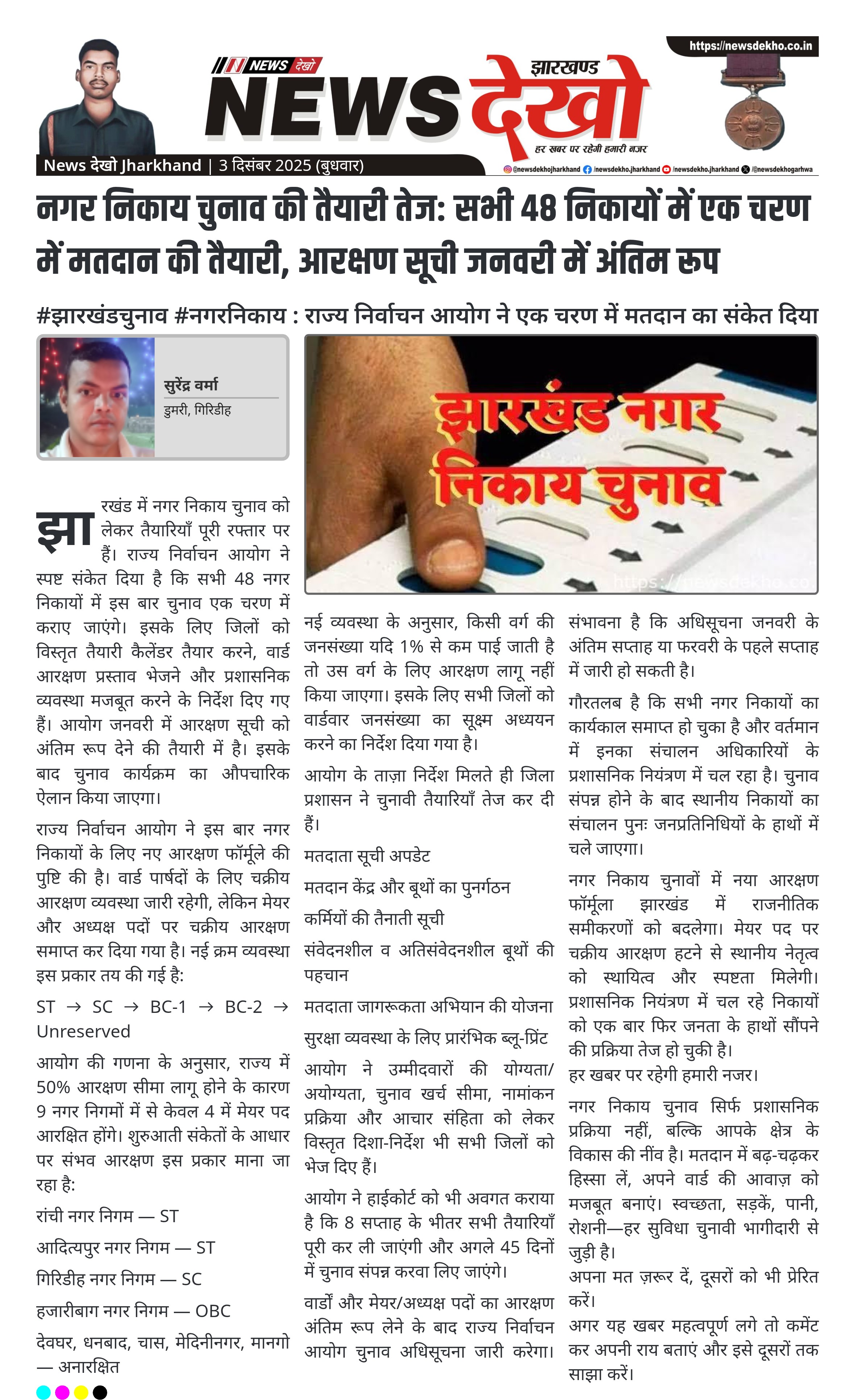 #झारखंडचुनाव #नगरनिकाय : राज्य निर्वाचन आयोग ने एक चरण में मतदान का संकेत दिया राज्य निर्वाचन आयोग (SEC) ने 48 नगर निकायों में एक ही चरण में चुनाव कराने की तैयारी शुरू की। जिलों से वार्ड आरक्षण प्रस्ताव भेजने और विस्तृत कैलेंडर तैयार करने का निर्देश दिया गया। नया आरक्षण फॉर्मूला: ST → SC → BC-1 → BC-2 → अनारक्षित। मेयर/अध्यक्ष पदों पर चक्रीय आरक्षण समाप्त, जबकि वार्ड पार्षदों पर चक्रीय आरक्षण जारी। रांची, आदित्यपुर (ST), गिरिडीह (SC) और हजारीबाग…