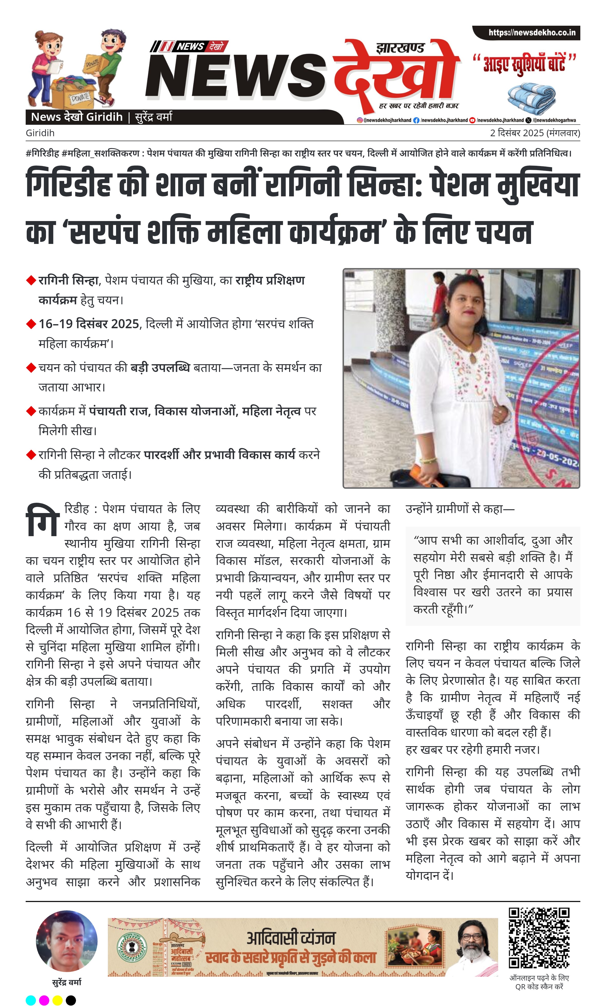 #गिरिडीह #महिला_सशक्तिकरण : पेशम पंचायत की मुखिया रागिनी सिन्हा का राष्ट्रीय स्तर पर चयन, दिल्ली में आयोजित होने वाले कार्यक्रम में करेंगी प्रतिनिधित्व। रागिनी सिन्हा, पेशम पंचायत की मुखिया, का राष्ट्रीय प्रशिक्षण कार्यक्रम हेतु चयन। 16–19 दिसंबर 2025, दिल्ली में आयोजित होगा ‘सरपंच शक्ति महिला कार्यक्रम’। चयन को पंचायत की बड़ी उपलब्धि बताया—जनता के समर्थन का जताया आभार। कार्यक्रम में पंचायती राज, विकास योजनाओं, महिला नेतृत्व पर मिलेगी सीख। रागिनी सिन्हा ने लौटकर पारदर्शी और प्रभावी विकास कार्य करने की…