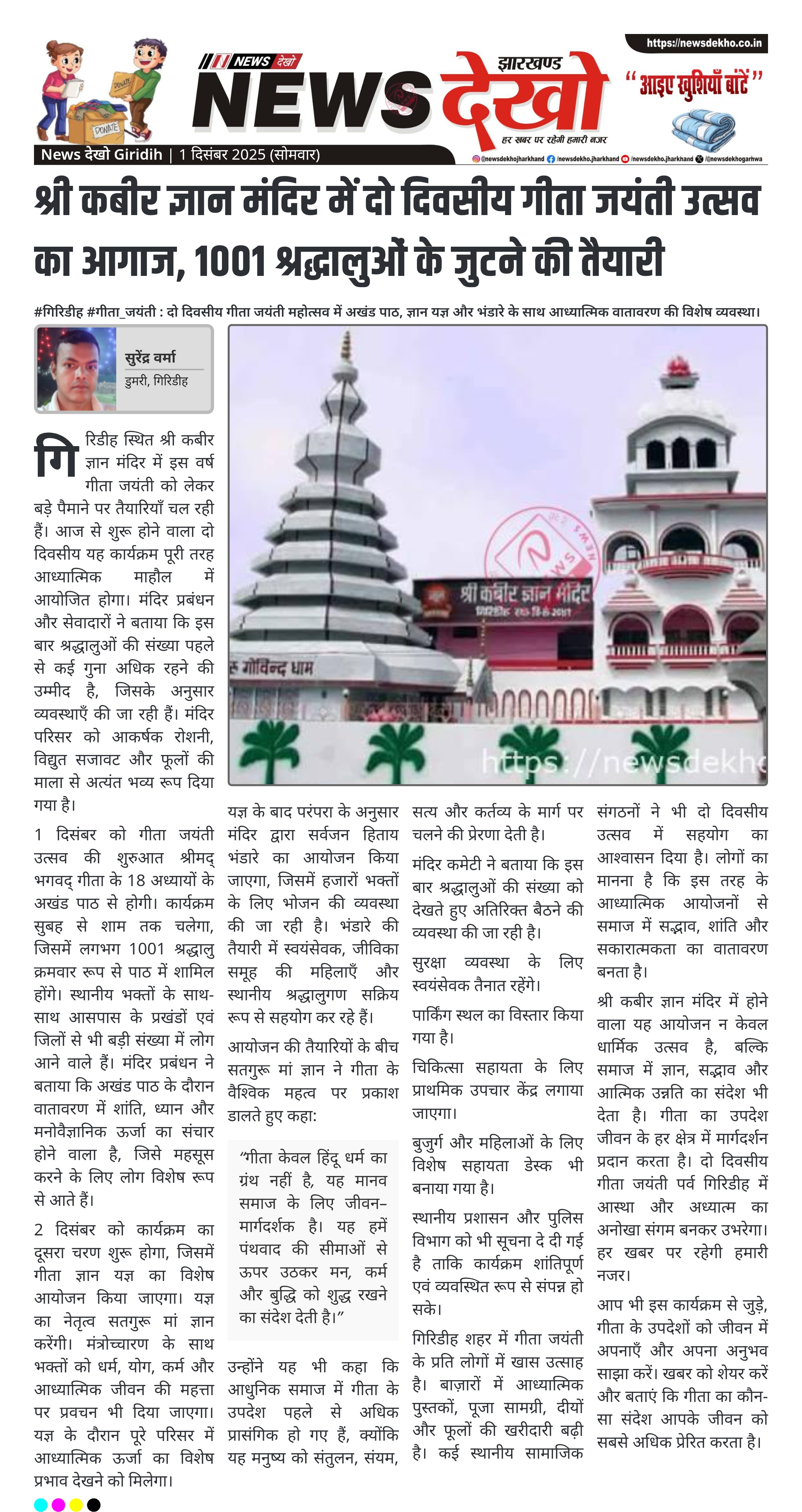 #गिरिडीह #गीता_जयंती : दो दिवसीय गीता जयंती महोत्सव में अखंड पाठ, ज्ञान यज्ञ और भंडारे के साथ आध्यात्मिक वातावरण की विशेष व्यवस्था। 1–2 दिसंबर 2025 को श्री कबीर ज्ञान मंदिर में गीता जयंती का भव्य आयोजन। पहले दिन 18 अध्यायों का अखंड पाठ, लगभग 1001 श्रद्धालुओं की सहभागिता। मंदिर परिसर रोशनी और पुष्प सज्जा से सुसज्जित, भक्तिमय माहौल तैयार। दूसरे दिन गीता ज्ञान यज्ञ सतगुरू मां ज्ञान के सान्निध्य में संपन्न होगा। समापन पर सभी भक्तों के लिए भंडारे की…