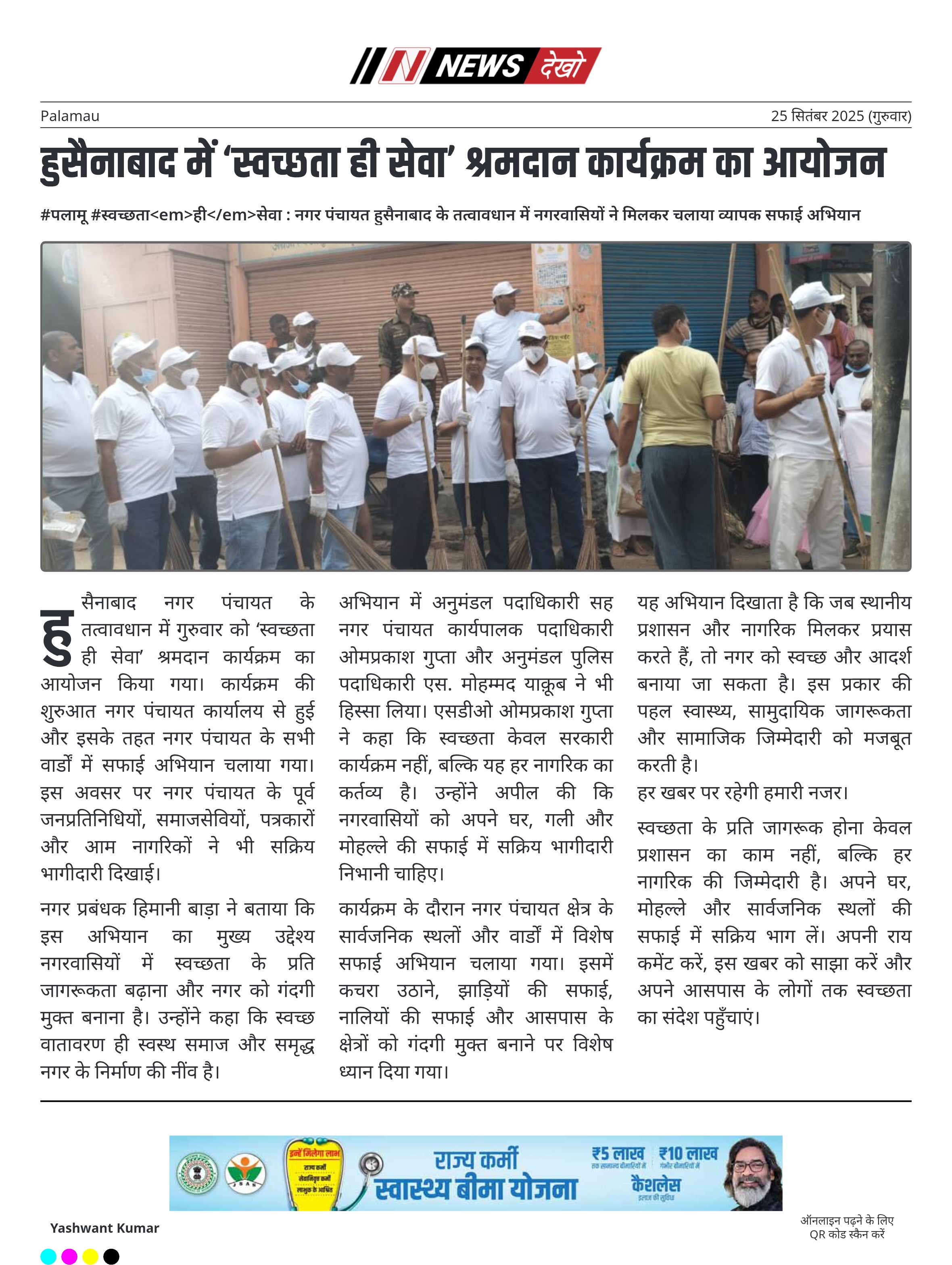 #पलामू #स्वच्छताहीसेवा : नगर पंचायत हुसैनाबाद के तत्वावधान में नगरवासियों ने मिलकर चलाया व्यापक सफाई अभियान नगर पंचायत हुसैनाबाद ने ‘स्वच्छता ही सेवा’ श्रमदान कार्यक्रम आयोजित किया। अभियान में पूर्व जनप्रतिनिधि, समाजसेवी, पत्रकार और नागरिक सक्रिय रूप से शामिल हुए। नगर प्रबंधक हिमानी बाड़ा ने स्वच्छता के महत्व पर जोर दिया। अनुमंडल पदाधिकारी ओमप्रकाश गुप्ता और अनुमंडल पुलिस पदाधिकारी एस. मोहम्मद याक़ूब भी अभियान में शामिल हुए। सार्वजनिक स्थलों और वार्डों में विशेष सफाई अभियान चलाया गया। अभियान का उद्देश्य…