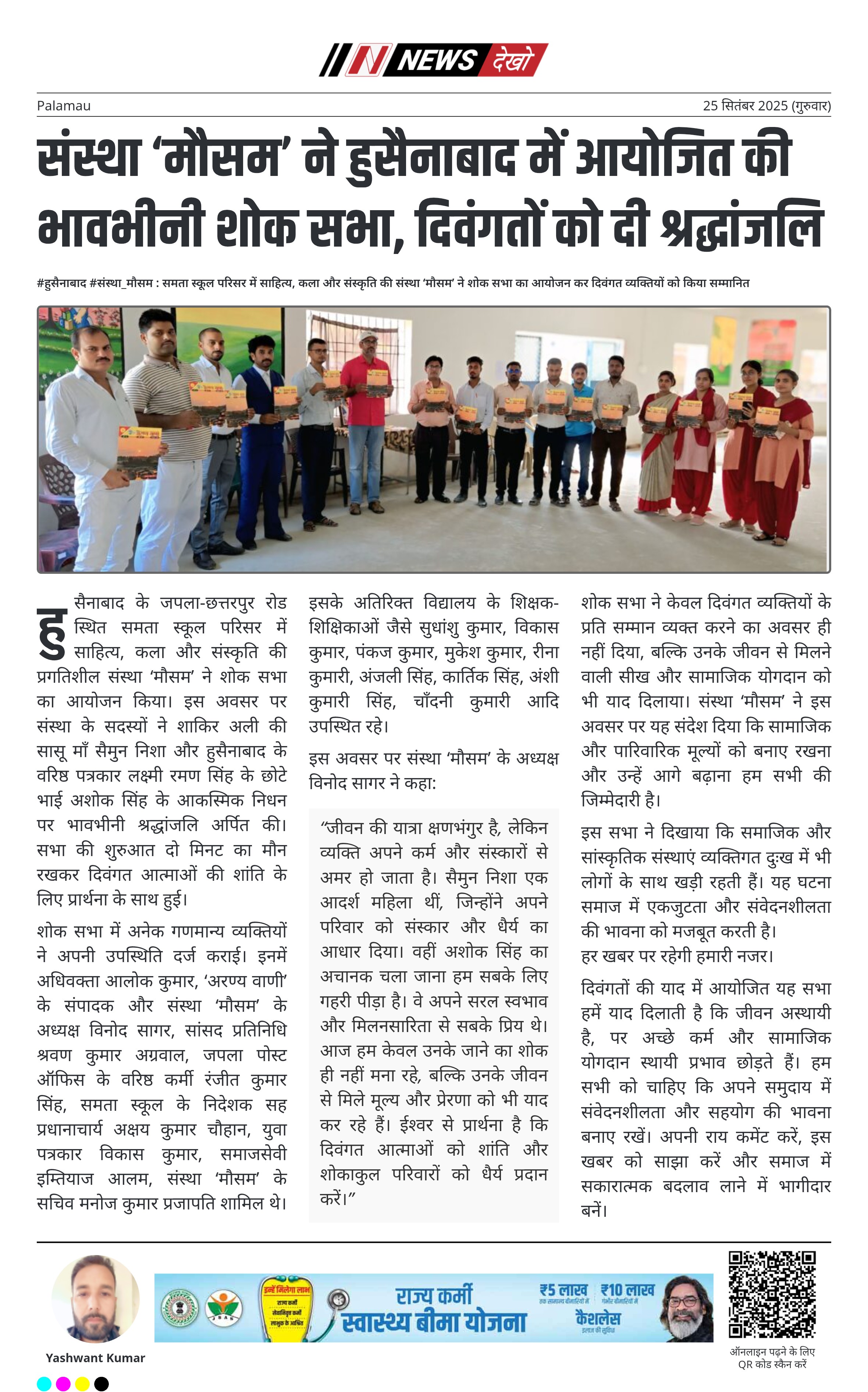 #हुसैनाबाद #संस्था_मौसम : समता स्कूल परिसर में साहित्य, कला और संस्कृति की संस्था ‘मौसम’ ने शोक सभा का आयोजन कर दिवंगत व्यक्तियों को किया सम्मानित शोक सभा का आयोजन जपला-धरहरा रोड के समीप समता स्कूल परिसर में हुआ। सभा में शाकिर अली की सासू माँ सैमुन निशा (65) और वरिष्ठ पत्रकार लक्ष्मी रमण सिंह के छोटे भाई अशोक सिंह (50) के आकस्मिक निधन पर श्रद्धांजलि दी गई। सभा की शुरुआत दो मिनट का मौन रखकर दिवंगत आत्माओं की शांति के…