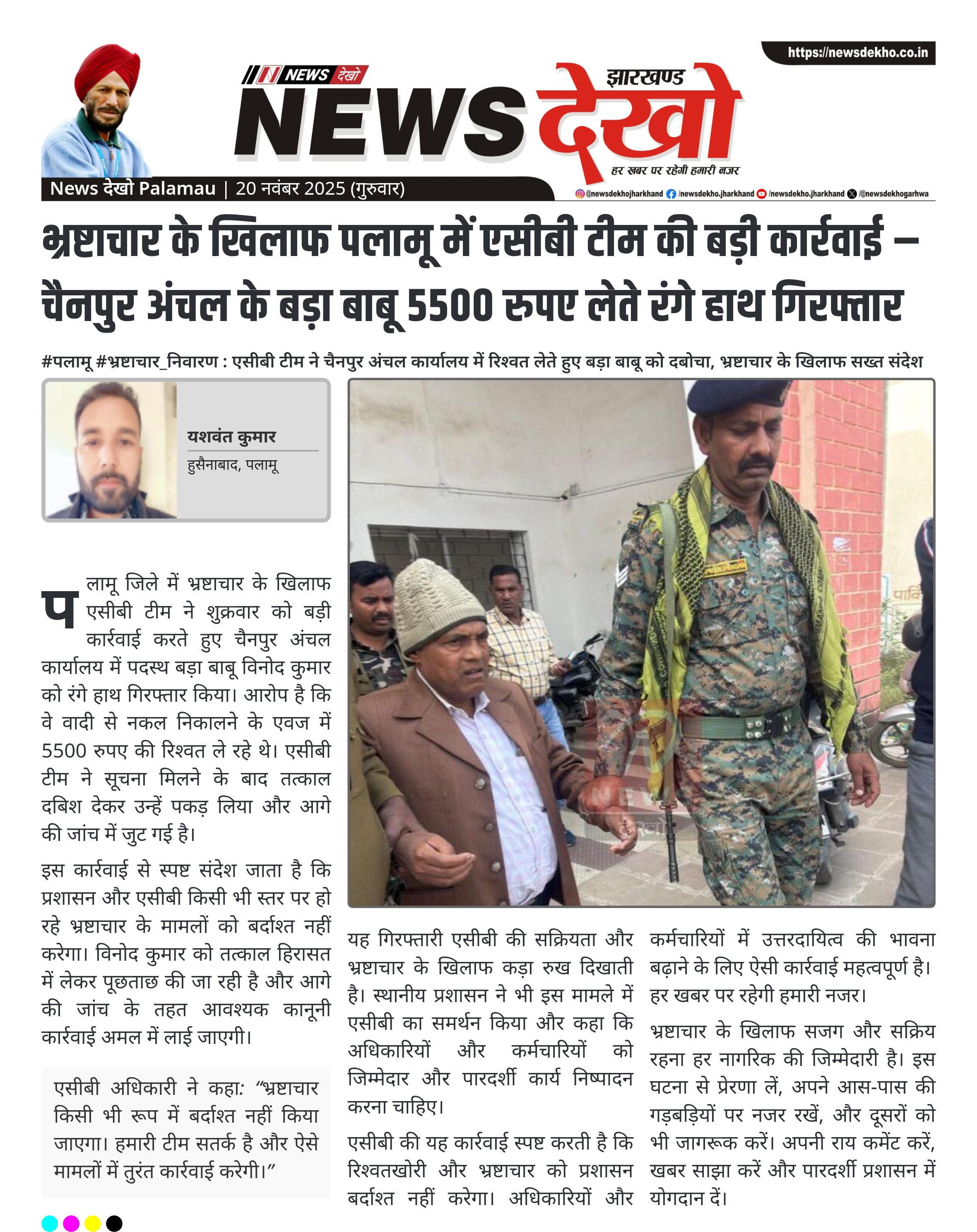 #पलामू #भ्रष्टाचार_निवारण : एसीबी टीम ने चैनपुर अंचल कार्यालय में रिश्वत लेते हुए बड़ा बाबू को दबोचा, भ्रष्टाचार के खिलाफ सख्त संदेश पलामू प्रमंडलीय एसीबी टीम ने बड़ी कार्रवाई की। चैनपुर अंचल कार्यालय में पदस्थ बड़ा बाबू विनोद कुमार को 5500 रुपए लेते रंगे हाथ गिरफ्तार। रिश्वत का पैसा नकल निकालने के एवज में लिया जा रहा था। गिरफ्तार होने के बाद एसीबी टीम ने आगे की कार्रवाई शुरू की। पलामू जिले में भ्रष्टाचार के खिलाफ एसीबी टीम ने शुक्रवार…