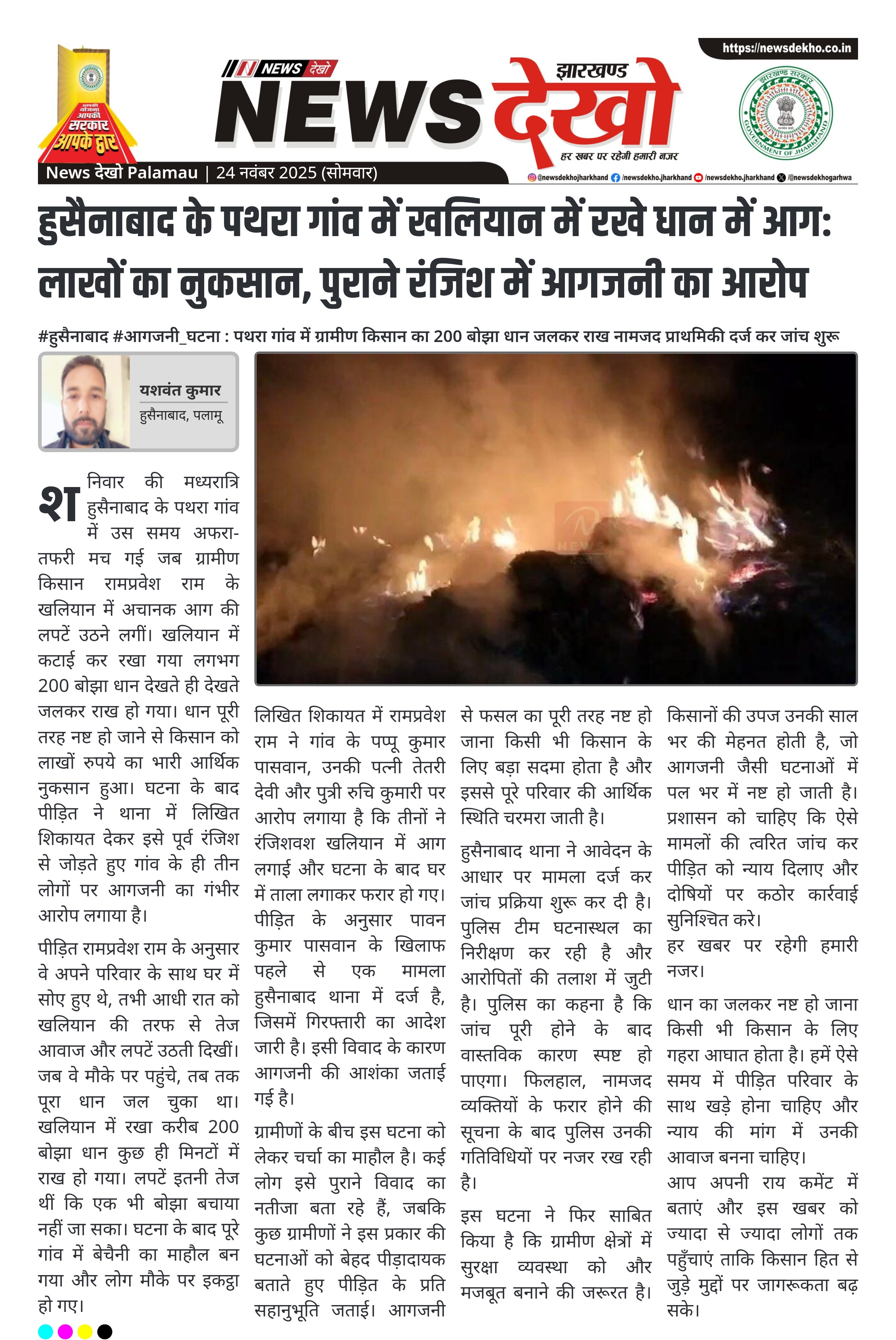#हुसैनाबाद #आगजनी_घटना : पथरा गांव में ग्रामीण किसान का 200 बोझा धान जलकर राख नामजद प्राथमिकी दर्ज कर जांच शुरू पथरा गांव में शनिवार की देर रात रामप्रवेश राम के खलियान में आगजनी। करीब 200 बोझा धान जलकर पूरी तरह नष्ट लाखों का नुकसान। भुक्तभोगी ने पप्पू कुमार पासवान, उनकी पत्नी तेतरी देवी और पुत्री रुचि कुमारी पर लगाया आग लगाने का आरोप। पूर्व रंजिश और लंबित केस से जुड़े विवाद को बताया कारण। हुसैनाबाद थाना में नामजद लिखित शिकायत…