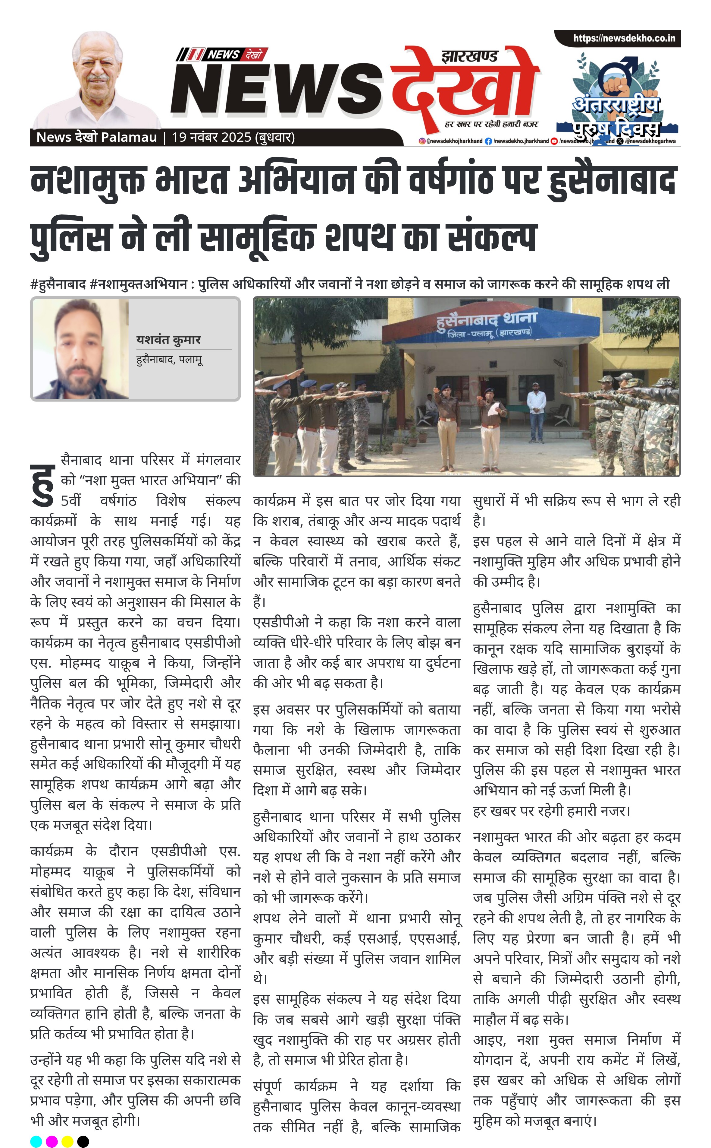 #हुसैनाबाद #नशामुक्तअभियान : पुलिस अधिकारियों और जवानों ने नशा छोड़ने व समाज को जागरूक करने की सामूहिक शपथ ली हुसैनाबाद थाना परिसर में “नशा मुक्त भारत अभियान” की 5वीं वर्षगांठ पर विशेष कार्यक्रम आयोजित। एसडीपीओ एस. मोहम्मद याक़ूब के नेतृत्व में पुलिसकर्मियों ने नशामुक्त समाज के निर्माण का संकल्प लिया। पुलिसकर्मियों को नशे से दूर रहने, अनुशासन का उदाहरण बनने और समाज का मार्गदर्शन करने की अपील। थाना प्रभारी सोनू कुमार चौधरी, एसआई, एएसआई सहित बड़ी संख्या में पुलिस जवान…