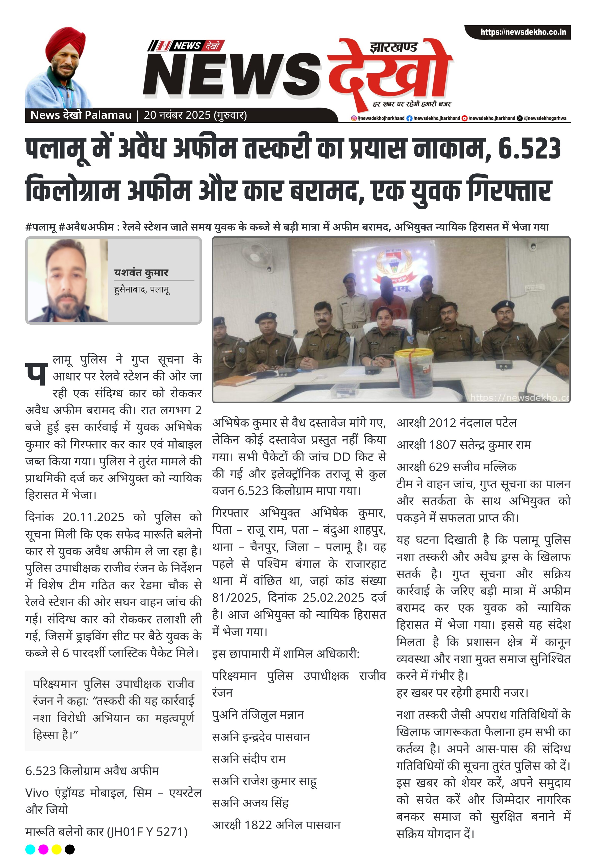 #पलामू #अवैधअफीम : रेलवे स्टेशन जाते समय युवक के कब्जे से बड़ी मात्रा में अफीम बरामद, अभियुक्त न्यायिक हिरासत में भेजा गया 6.523 किलोग्राम अफीम बरामद। गिरफ्तार युवक अभिषेक कुमार, उम्र 22 वर्ष। वाहन मारूति बलेनो (JH01F Y 5271) जब्त। मामला दर्ज NDPS Act 1985 की धाराओं 17(c), 18(b), 22(c), 29। अभियुक्त पश्चिम बंगाल में पहले से वांछित। छापामारी दल में 10 पुलिस अधिकारी शामिल। पलामू पुलिस ने गुप्त सूचना के आधार पर रेलवे स्टेशन की ओर जा रही एक…