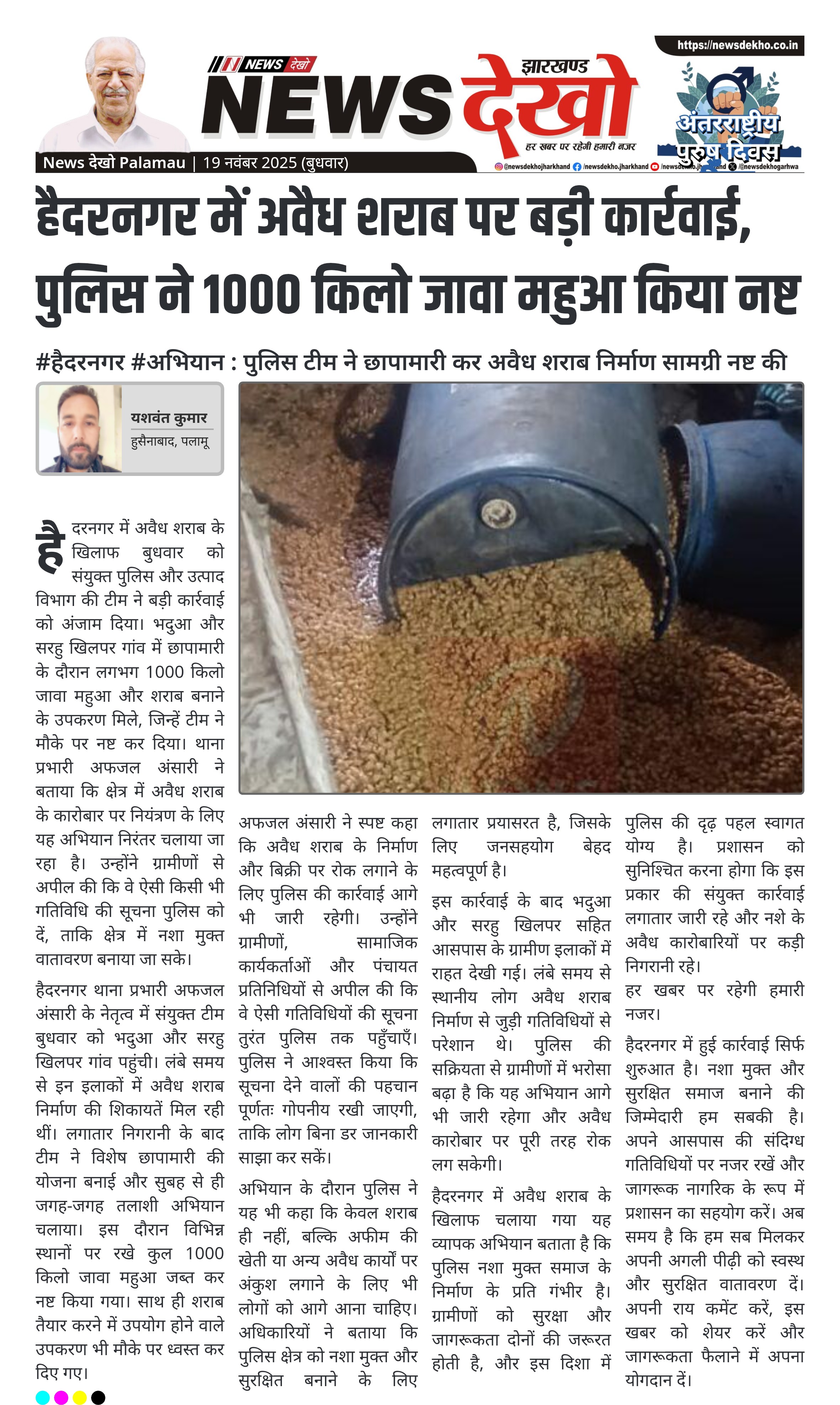 #हैदरनगर #अभियान : पुलिस टीम ने छापामारी कर अवैध शराब निर्माण सामग्री नष्ट की हैदरनगर थाना और उत्पाद विभाग की संयुक्त कार्रवाई। भदुआ और सरहु खिलपर में 1000 किलो जावा महुआ नष्ट किया गया। थाना प्रभारी अफजल अंसारी के नेतृत्व में अभियान संचालित। आम लोगों को अवैध गतिविधियों की सूचना देने की अपील की गई। सूचना देने वालों की पहचान गोपनीय रखने का आश्वासन। हैदरनगर में अवैध शराब के खिलाफ बुधवार को संयुक्त पुलिस और उत्पाद विभाग की टीम ने…