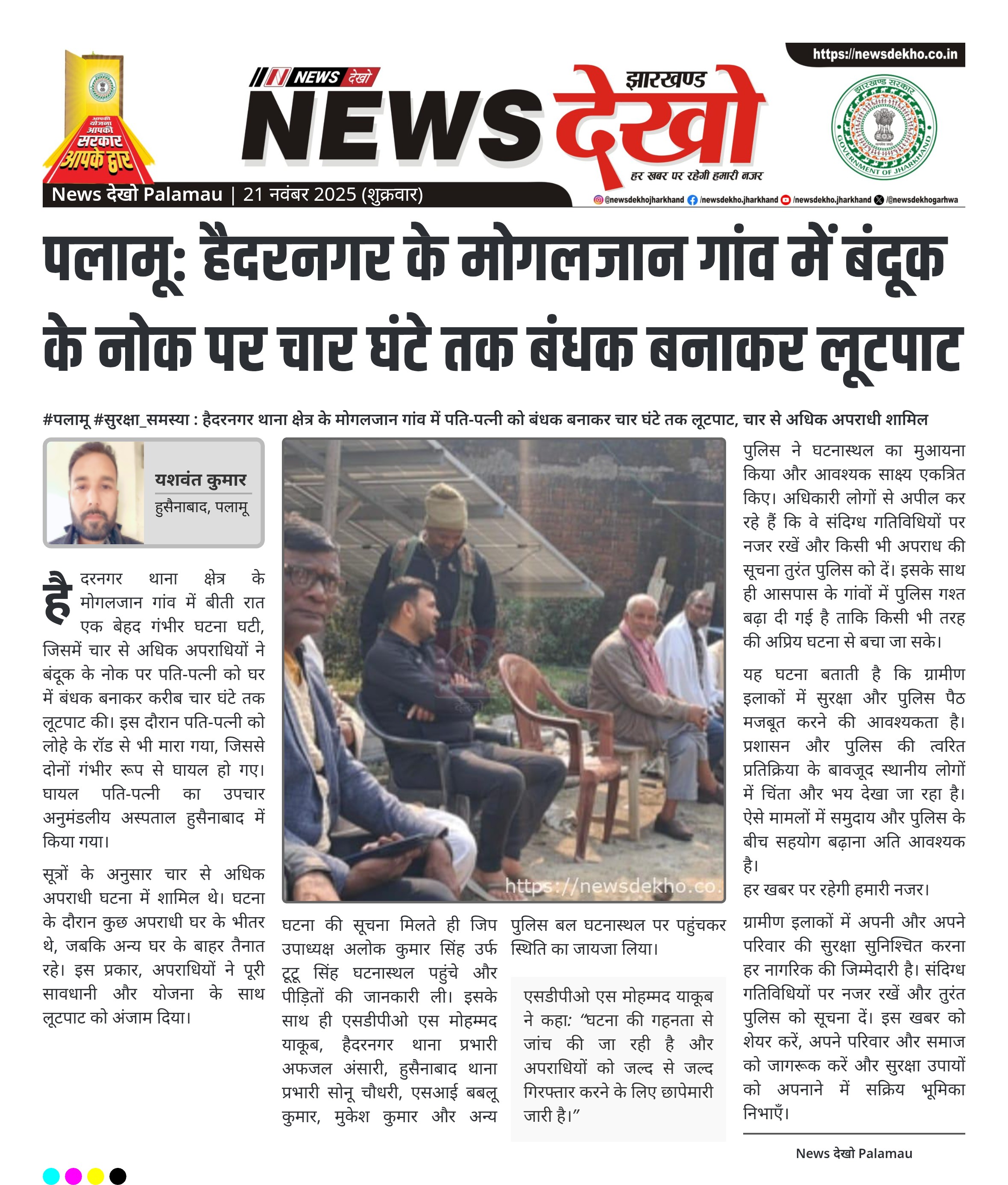 #पलामू #सुरक्षा_समस्या : हैदरनगर थाना क्षेत्र के मोगलजान गांव में पति-पत्नी को बंधक बनाकर चार घंटे तक लूटपाट, चार से अधिक अपराधी शामिल मोगलजान गांव, हैदरनगर थाना क्षेत्र में बीती रात्रि लूटपाट। पति-पत्नी को घर में बंधक बनाया गया और लोहे के रॉड से पीटा गया। चार से अधिक अपराधी लूटपाट में शामिल थे, कुछ घर के बाहर मौजूद। घायल पति-पत्नी का उपचार अनुमंडलीय अस्पताल हुसैनाबाद में किया गया। जिप उपाध्यक्ष अलोक कुमार सिंह उर्फ टूटू सिंह, एसडीपीओ एस मोहम्मद…