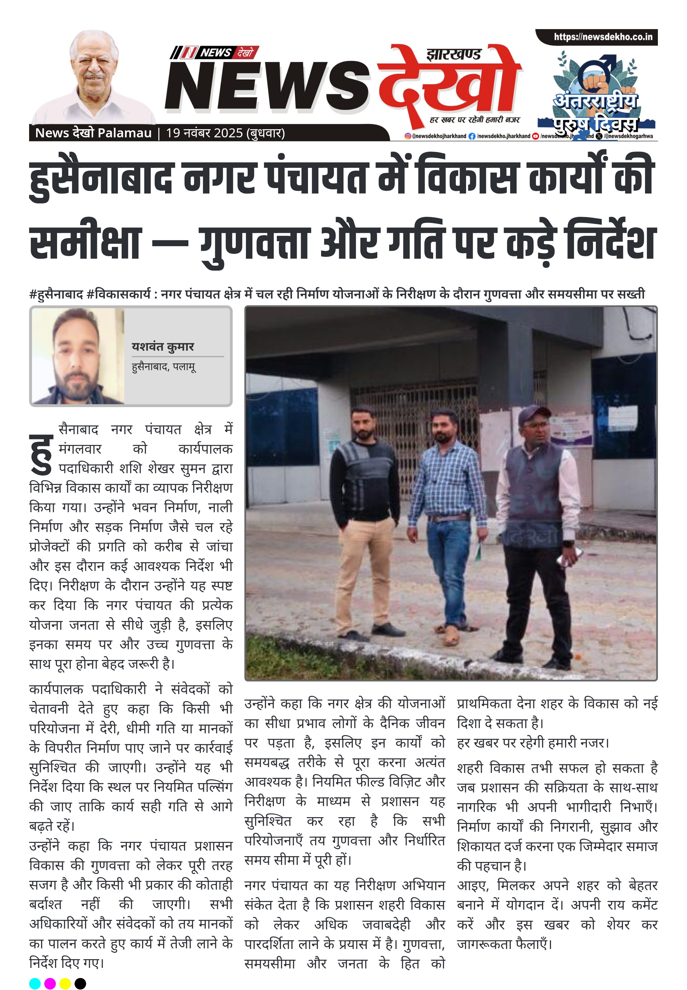 #हुसैनाबाद #विकासकार्य : नगर पंचायत क्षेत्र में चल रही निर्माण योजनाओं के निरीक्षण के दौरान गुणवत्ता और समयसीमा पर सख्ती कार्यपालक पदाधिकारी शशि शेखर सुमन ने विभिन्न योजनाओं का स्थलीय निरीक्षण किया। भवन, नाली और सड़क निर्माण कार्यों की प्रगति की बारीकी से समीक्षा की गई। सभी संवेदकों को गुणवत्ता बनाए रखने और समय से काम पूरा करने का निर्देश। मानकों से विपरीत निर्माण पर कड़ी कार्रवाई की चेतावनी दी गई। नगर पंचायत प्रशासन ने कहा—सभी योजनाएँ जनता से सीधे…