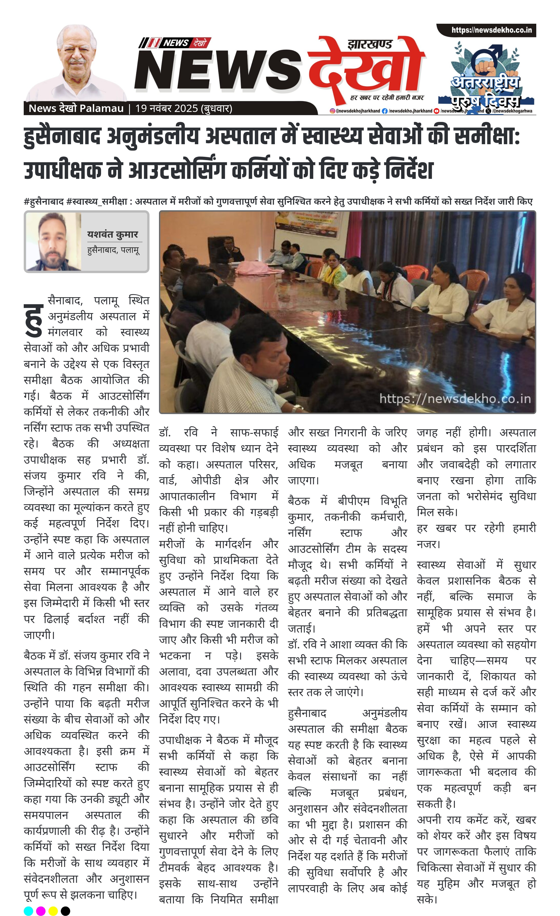 #हुसैनाबाद #स्वास्थ्य_समीक्षा : अस्पताल में मरीजों को गुणवत्तापूर्ण सेवा सुनिश्चित करने हेतु उपाधीक्षक ने सभी कर्मियों को सख्त निर्देश जारी किए हुसैनाबाद अनुमंडलीय अस्पताल में आउटसोर्सिंग कर्मियों की महत्वपूर्ण समीक्षा बैठक। बैठक की अध्यक्षता उपाधीक्षक सह प्रभारी डॉ. संजय कुमार रवि ने की। कर्मियों को निर्देश–मरीजों को सम्मानपूर्वक, समय पर और गुणवत्तापूर्ण सेवा दी जाए। ड्यूटी, अनुशासन, साफ-सफाई, ओपीडी और आपातकालीन सेवाओं पर विशेष जोर। बैठक में बीपीएम विभूति कुमार, तकनीकी व नर्सिंग स्टाफ सहित कई चिकित्सा कर्मियों की उपस्थिति।…