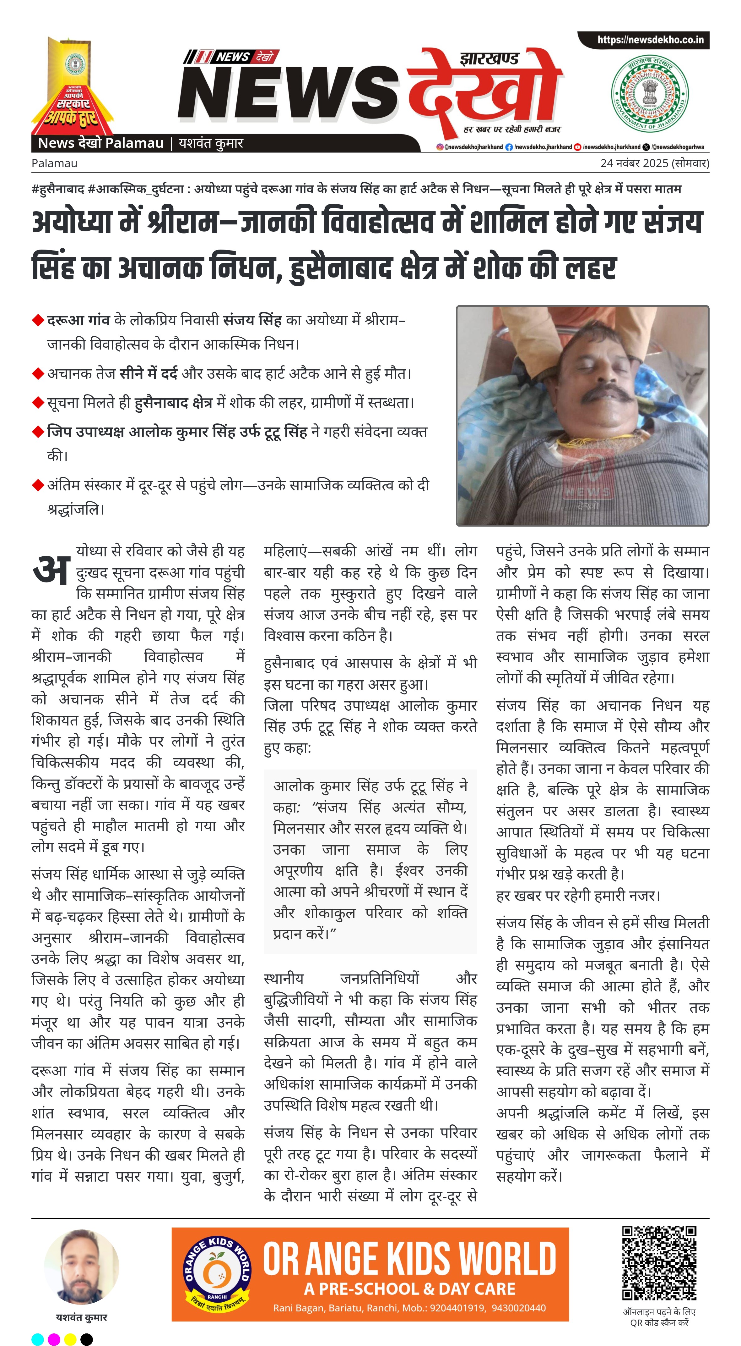 #हुसैनाबाद #आकस्मिक_दुर्घटना : अयोध्या पहुंचे दरूआ गांव के संजय सिंह का हार्ट अटैक से निधन—सूचना मिलते ही पूरे क्षेत्र में पसरा मातम दरूआ गांव के लोकप्रिय निवासी संजय सिंह का अयोध्या में श्रीराम–जानकी विवाहोत्सव के दौरान आकस्मिक निधन। अचानक तेज सीने में दर्द और उसके बाद हार्ट अटैक आने से हुई मौत। सूचना मिलते ही हुसैनाबाद क्षेत्र में शोक की लहर, ग्रामीणों में स्तब्धता। जिप उपाध्यक्ष आलोक कुमार सिंह उर्फ टूटू सिंह ने गहरी संवेदना व्यक्त की। अंतिम संस्कार में…