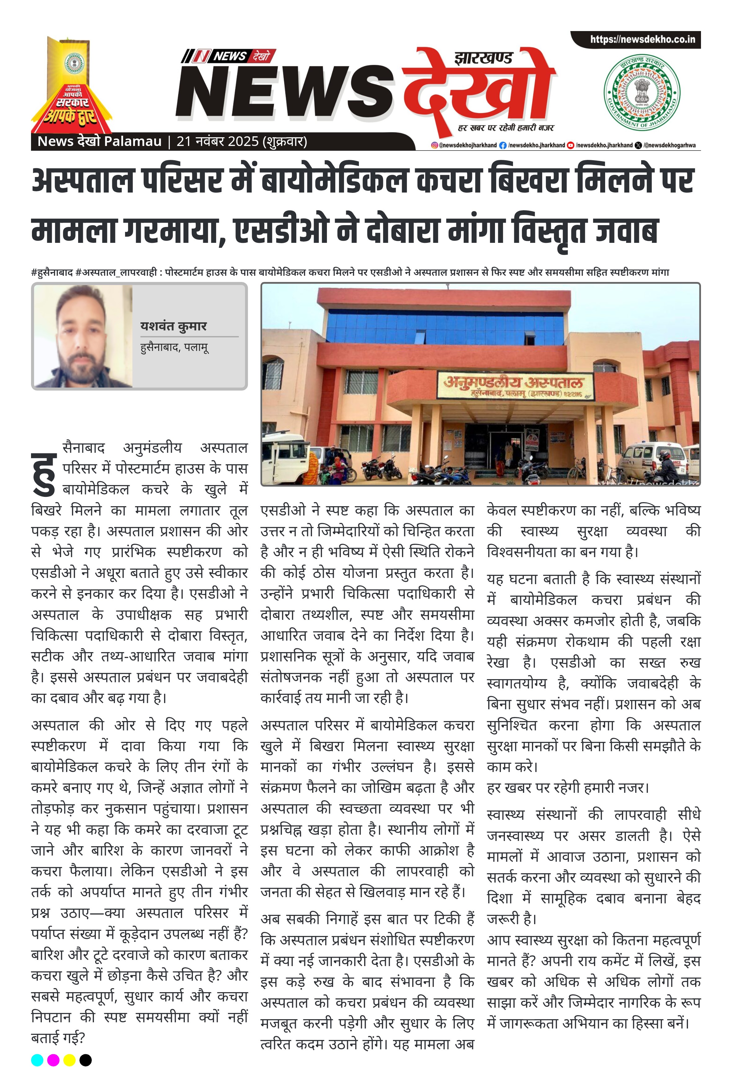 #हुसैनाबाद #अस्पताल_लापरवाही : पोस्टमार्टम हाउस के पास बायोमेडिकल कचरा मिलने पर एसडीओ ने अस्पताल प्रशासन से फिर स्पष्ट और समयसीमा सहित स्पष्टीकरण मांगा हुसैनाबाद अनुमंडलीय अस्पताल में बायोमेडिकल कचरा बिखरा मिला। अस्पताल के शुरुआती स्पष्टीकरण से एसडीओ असंतुष्ट। प्रभारी चिकित्सा पदाधिकारी से दोबारा विस्तृत जवाब तलब। एसडीओ ने तीन गंभीर सवाल उठाते हुए जिम्मेदारी तय करने को कहा। कचरा निपटान में लापरवाही पर प्रशासनिक कार्रवाई की आशंका। हुसैनाबाद अनुमंडलीय अस्पताल परिसर में पोस्टमार्टम हाउस के पास बायोमेडिकल कचरे के खुले…