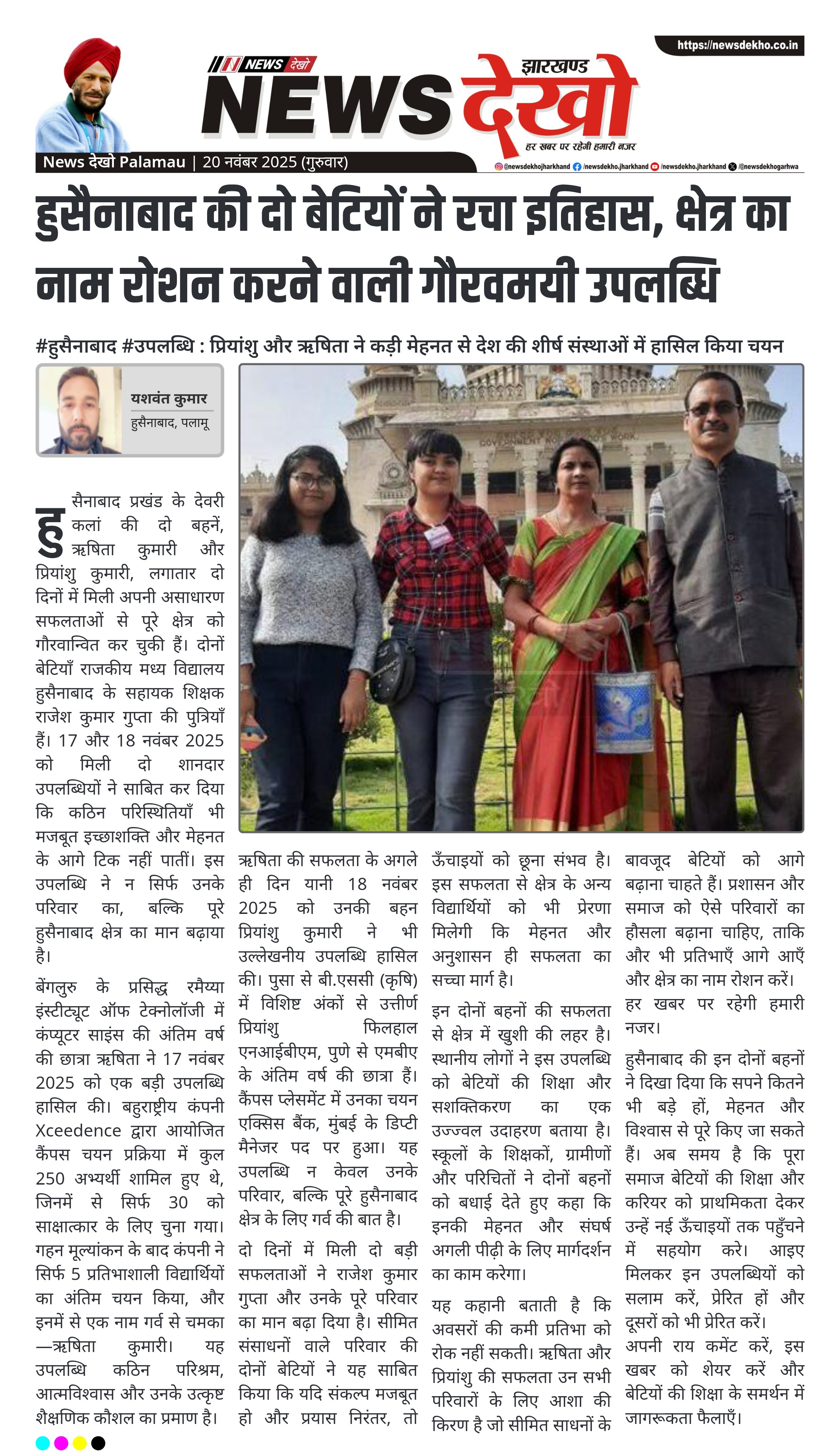#हुसैनाबाद #उपलब्धि : प्रियांशु और ऋषिता ने कड़ी मेहनत से देश की शीर्ष संस्थाओं में हासिल किया चयन देवरी कलां, हुसैनाबाद की दो छात्राओं की राष्ट्रीय स्तर पर बड़ी सफलता। ऋषिता कुमारी का चयन Xceedence Company द्वारा आयोजित कैंपस प्लेसमेंट में शीर्ष 5 अभ्यर्थियों में। प्रियांशु कुमारी को एक्सिस बैंक, मुंबई में डिप्टी मैनेजर पद मिला। दोनों बेटियाँ सहायक शिक्षक राजेश कुमार गुप्ता की प्रतिभाशाली पुत्रियाँ। सीमित संसाधनों के बावजूद लगन और दृढ़ संकल्प से प्राप्त की उपलब्धि। हुसैनाबाद प्रखंड…