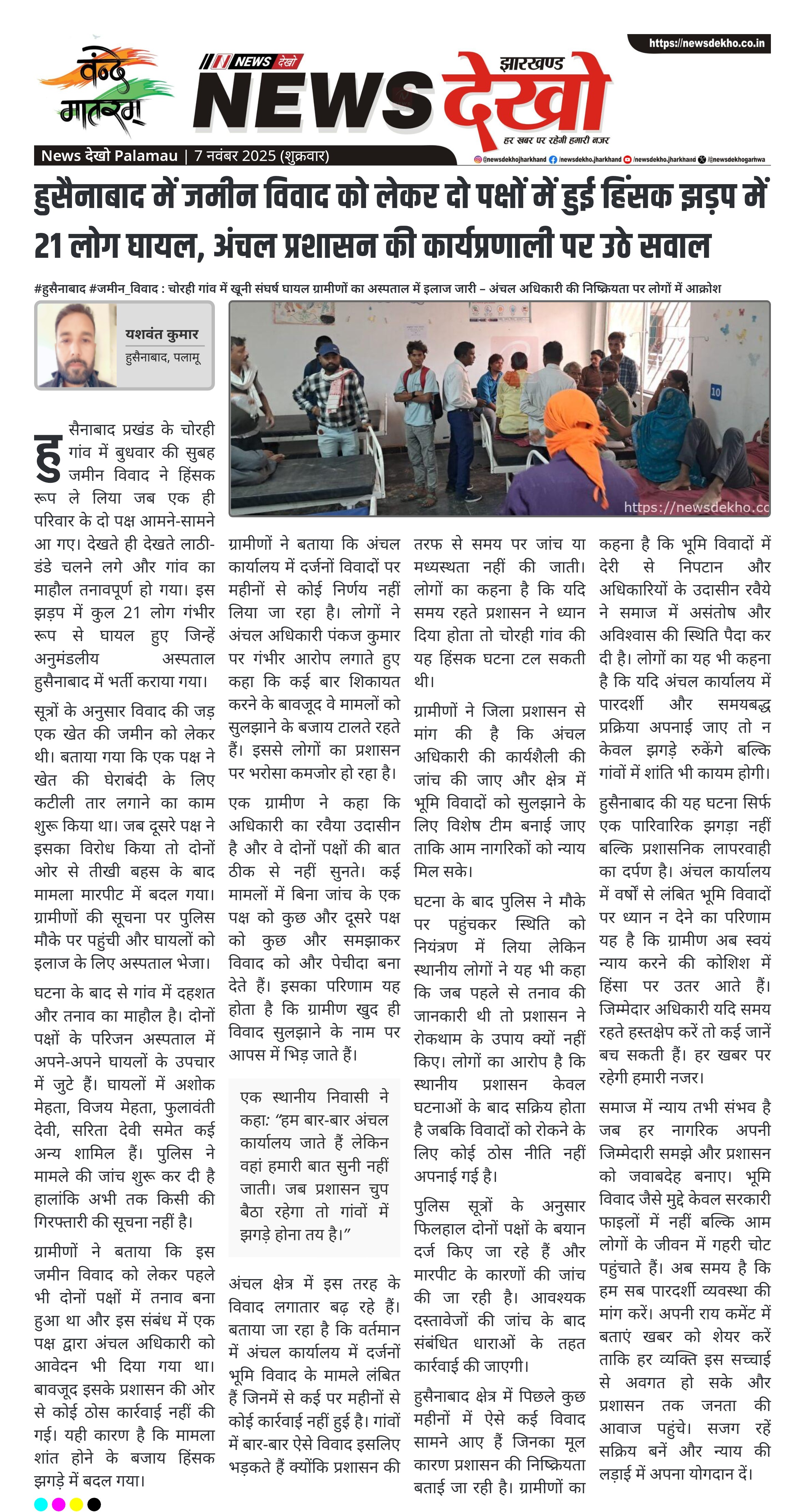 #हुसैनाबाद #जमीन_विवाद : चोरही गांव में खूनी संघर्ष घायल ग्रामीणों का अस्पताल में इलाज जारी – अंचल अधिकारी की निष्क्रियता पर लोगों में आक्रोश हुसैनाबाद अंचल क्षेत्र के चोरही गांव में जमीन विवाद को लेकर बुधवार की सुबह दो पक्षों में हुई भीषण मारपीट में 21 लोग घायल हुए। घायलों को तुरंत अनुमंडलीय अस्पताल हुसैनाबाद भेजा गया जहां सभी का इलाज जारी है। विवाद उस समय भड़का जब एक पक्ष ने कटीली तार से घेराबंदी शुरू की जिसका दूसरे पक्ष…