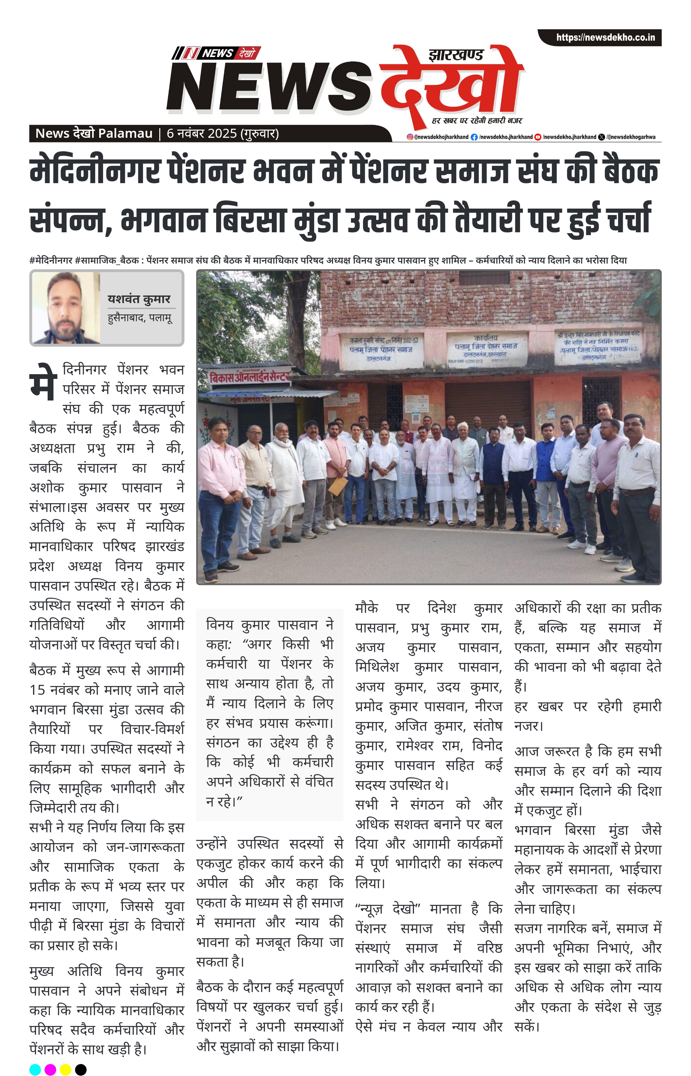 #मेदिनीनगर #सामाजिक_बैठक : पेंशनर समाज संघ की बैठक में मानवाधिकार परिषद अध्यक्ष विनय कुमार पासवान हुए शामिल – कर्मचारियों को न्याय दिलाने का भरोसा दिया मेदिनीनगर पेंशनर भवन परिसर में पेंशनर समाज संघ की बैठक आयोजित की गई। बैठक की अध्यक्षता प्रभु राम ने की और संचालन अशोक कुमार पासवान ने किया। मुख्य अतिथि के रूप में न्यायिक मानवाधिकार परिषद झारखंड प्रदेश अध्यक्ष विनय कुमार पासवान शामिल हुए। आगामी 15 नवंबर को आयोजित होने वाले भगवान बिरसा मुंडा उत्सव की…