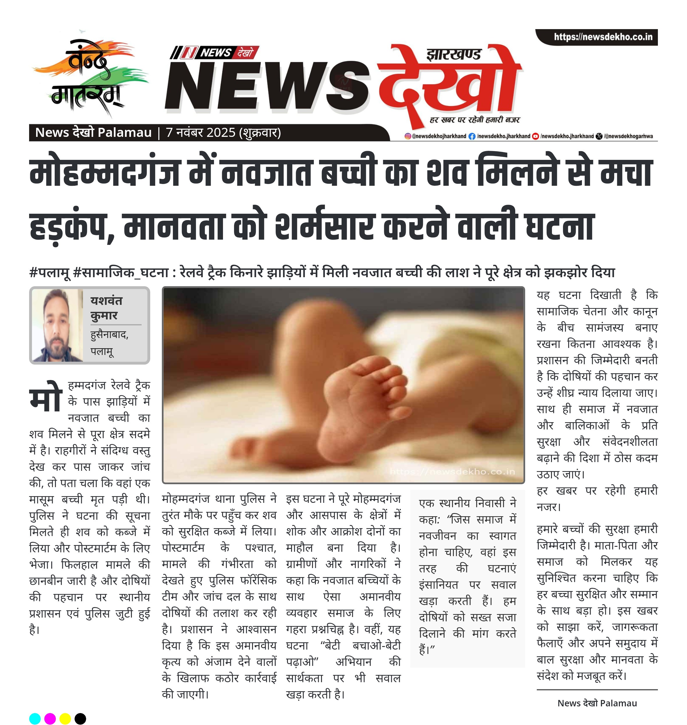 #पलामू #सामाजिक_घटना : रेलवे ट्रैक किनारे झाड़ियों में मिली नवजात बच्ची की लाश ने पूरे क्षेत्र को झकझोर दिया हुसैनाबाद के मोहम्मदगंज क्षेत्र में रेलवे ट्रैक के पास झाड़ियों में एक नवजात बच्ची का शव मिलने से सनसनी फैल गई। बच्ची की उम्र लगभग 10 से 15 दिन बताई जा रही है और शव को पुलिस ने कब्जे में लेकर पोस्टमार्टम के लिए भेजा। घटना की जानकारी मिलने पर मोहम्मदगंज थाना पुलिस ने मौके पर पहुंचकर मामले की छानबीन शुरू…