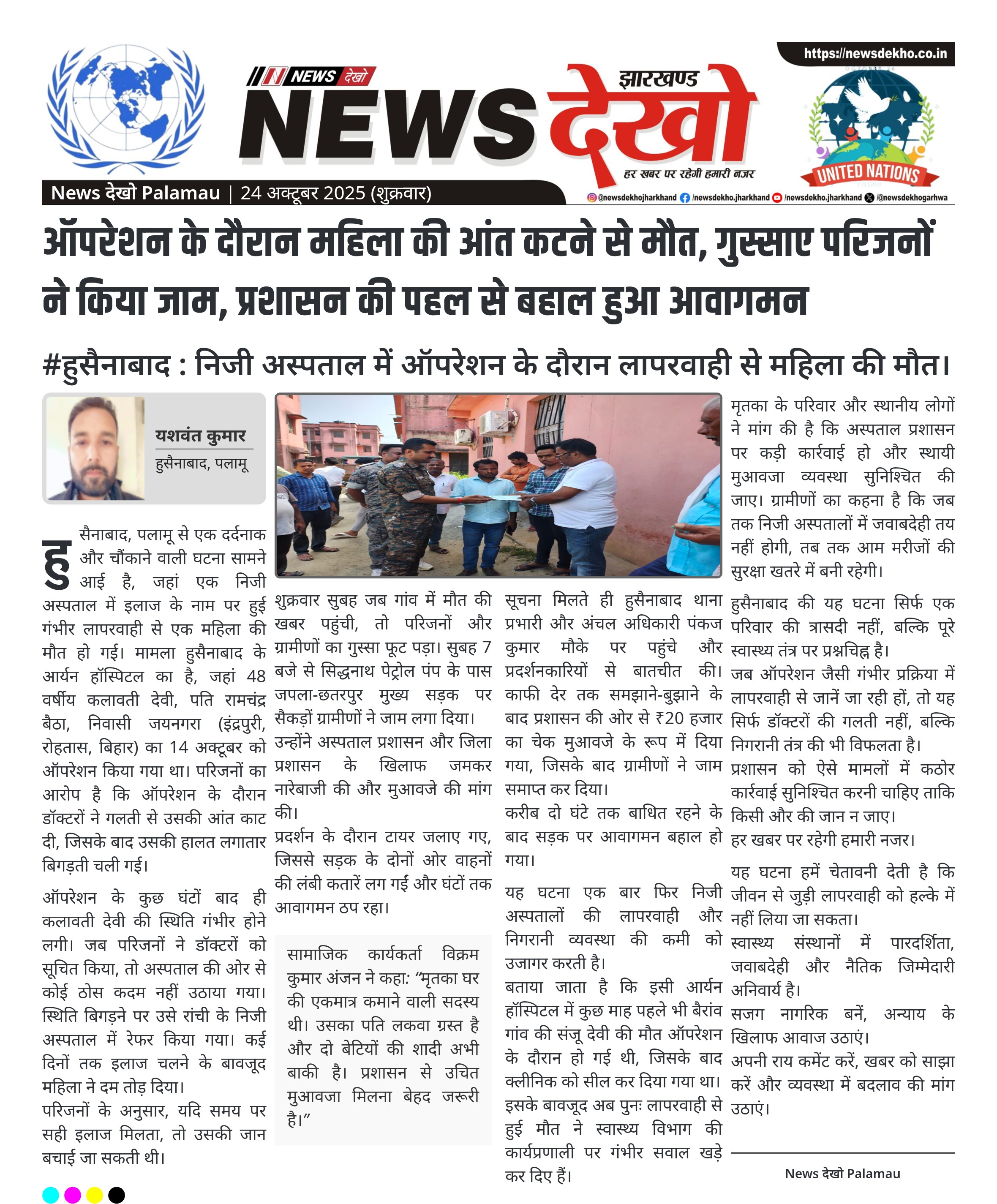 #हुसैनाबाद : निजी अस्पताल में ऑपरेशन के दौरान लापरवाही से महिला की मौत। आर्यन हॉस्पिटल हुसैनाबाद में ऑपरेशन के दौरान महिला की आंत काट दी गई। रांची रेफर करने के बाद भी इलाज के दौरान महिला की मौत हो गई। परिजनों और ग्रामीणों ने जपला-छतरपुर रोड पर जाम लगाया। प्रदर्शनकारियों ने मुआवजे की मांग करते हुए जमकर की नारेबाजी। प्रशासन की पहल से ₹20 हजार मुआवजा देकर जाम समाप्त हुआ। हुसैनाबाद, पलामू से एक दर्दनाक और चौंकाने वाली घटना सामने…